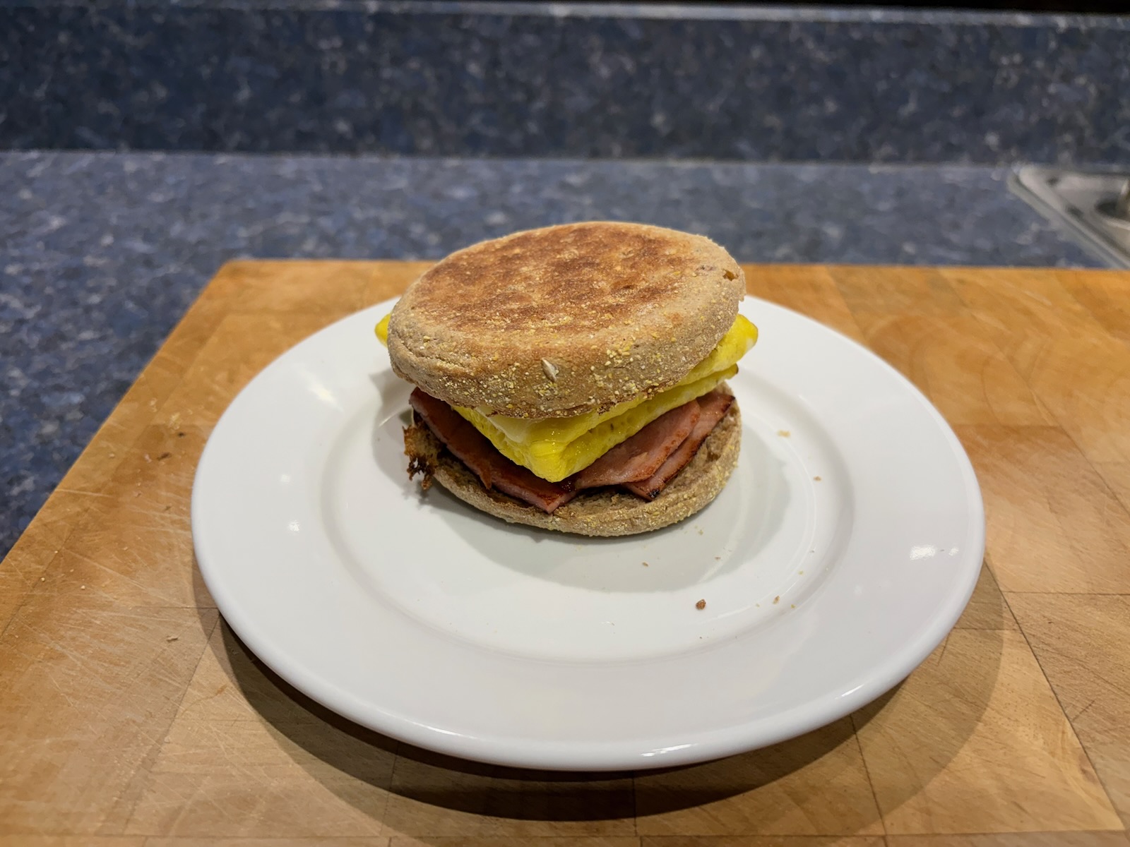 Breakfast: Ham, egg and cheese English muffin sandwich. With 2.3 oz. ham.