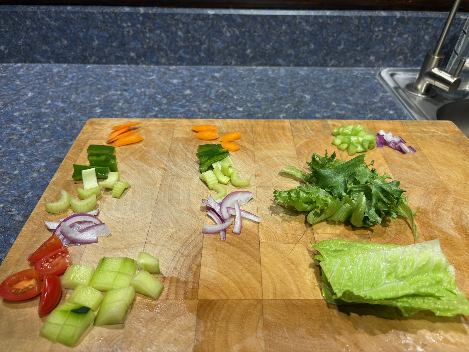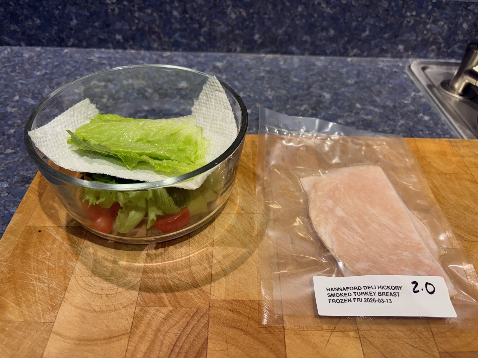 Lunch: Turkey sandwich with 2.0 oz. smoked deli turkey, lettuce, and mayo on Heidelberg French peasant bread. A side salad with lettuce mix, cucumber, tomato, and balsamic dressing.