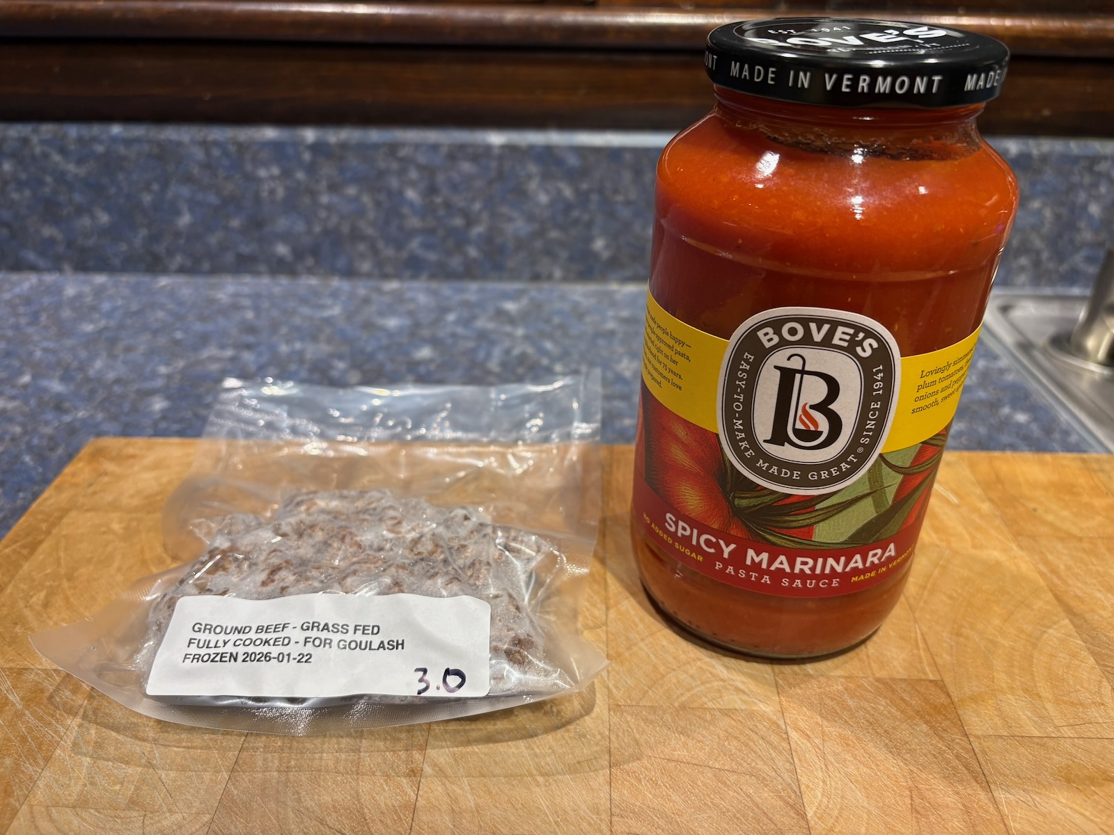 Dinner: Simple goulash with 3.0 oz. ground beef, onion, and garlic (previously frozen), 4.5 oz. marinara, and 1.6 oz. pasta elbows. A half glass of Bota Box pinot noir.