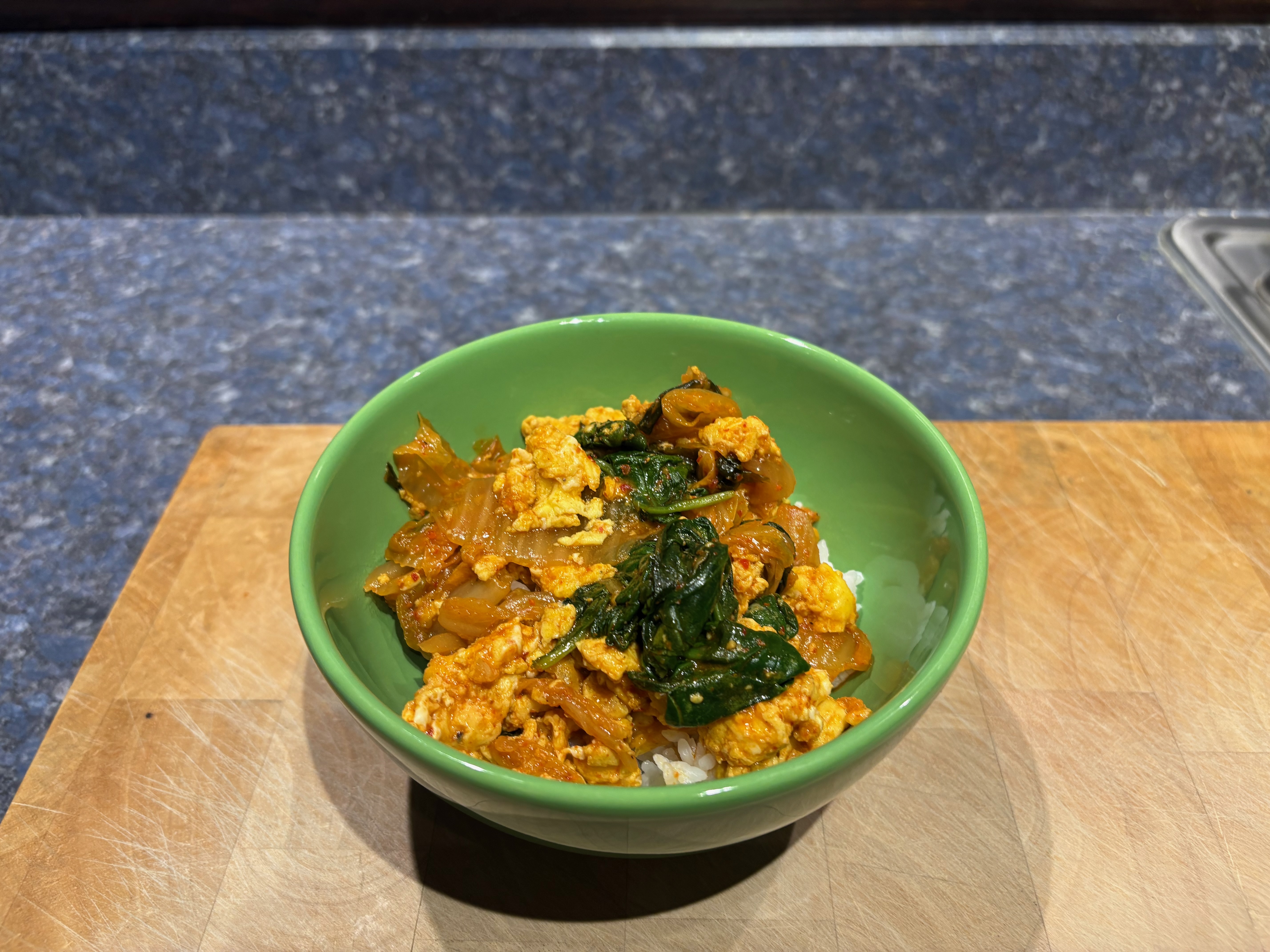 Breakfast: Kimchi scrambled eggs on a bed of rice.