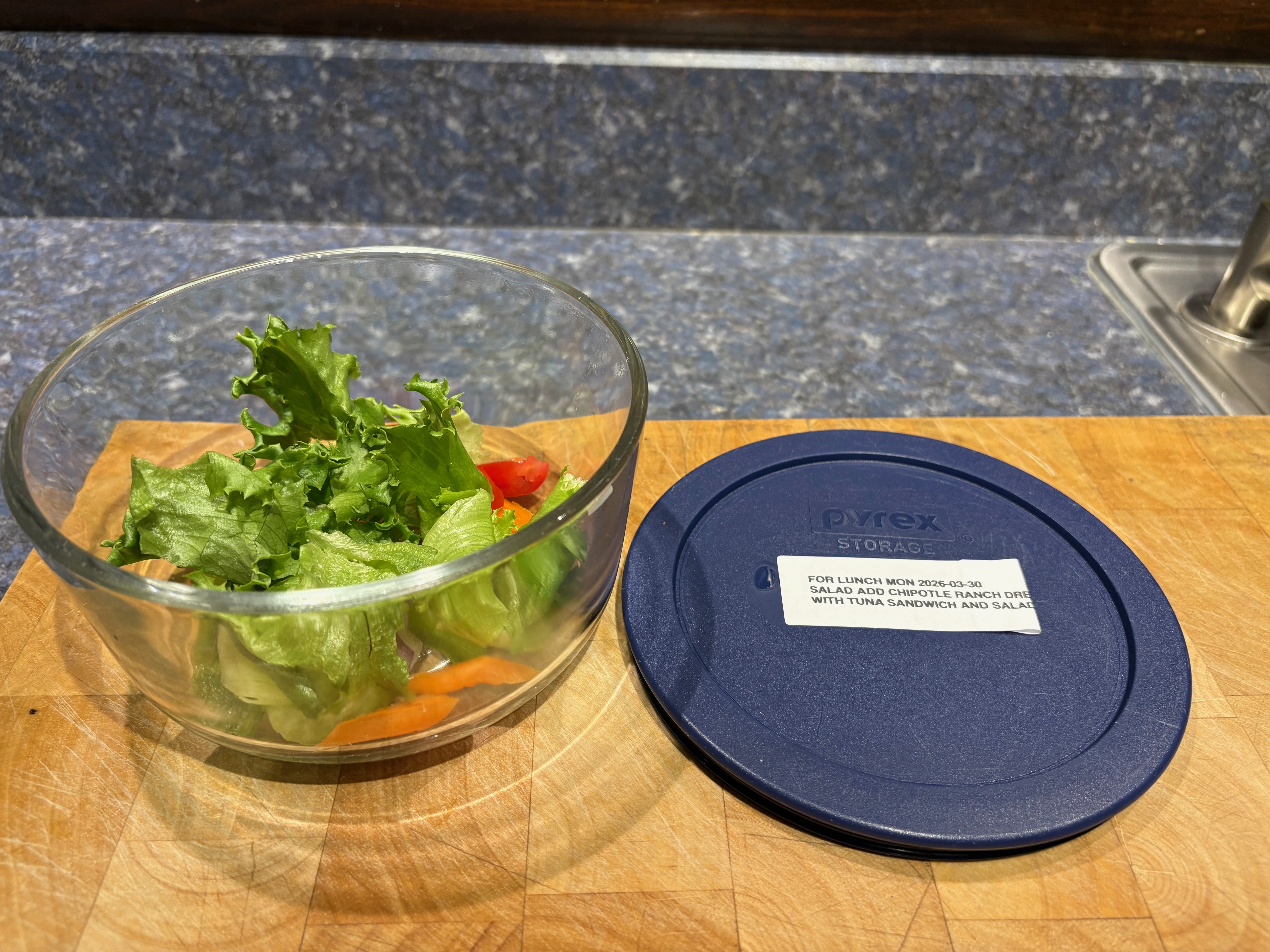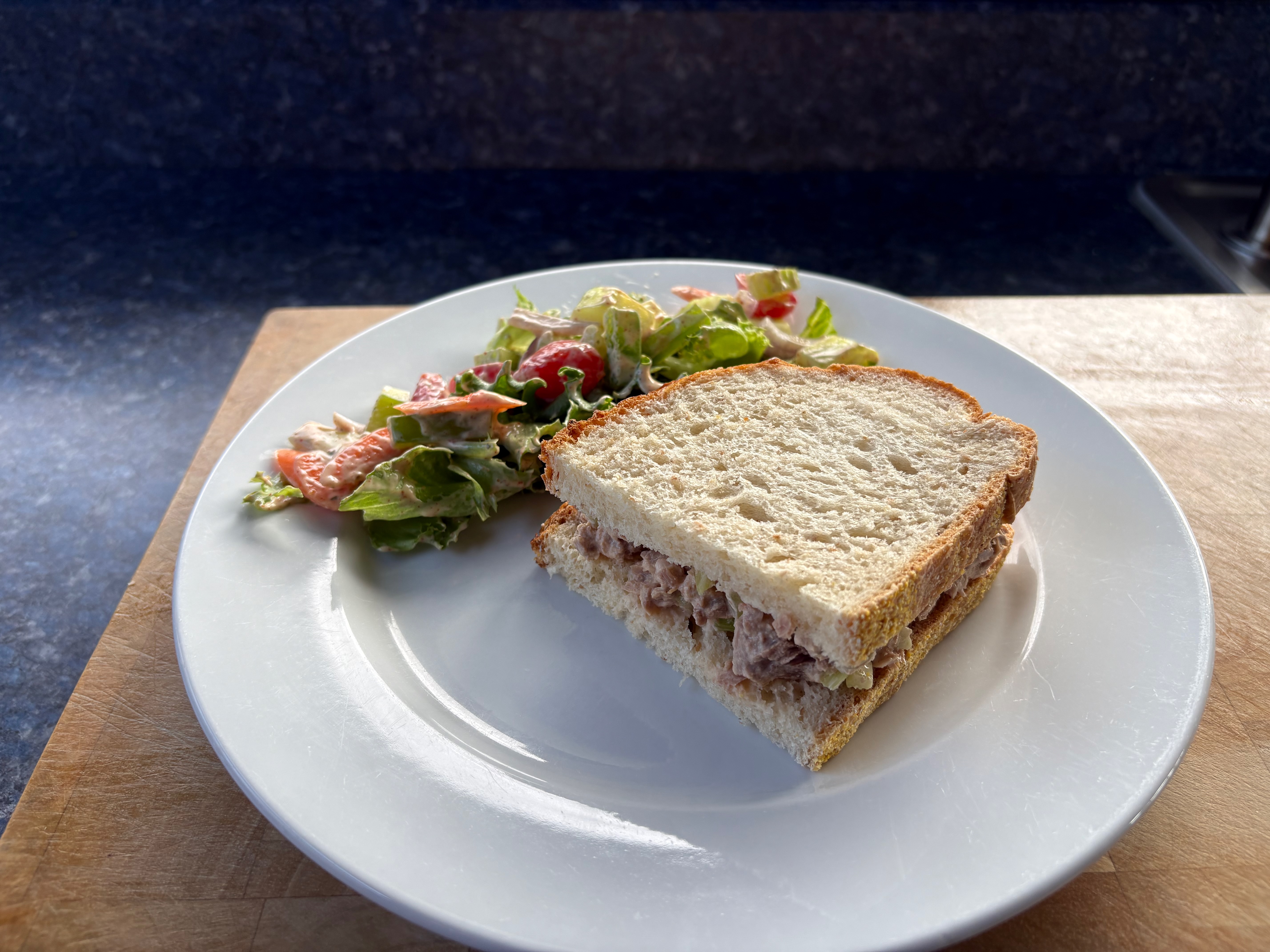 Lunch: Spicy tuna salad sandwich on Heidelberg French peasant bread. Salad with lettuce mix, cucumber, tomato, carrot, celery, green pepper, red onion, and chipotle ranch dressing (20 grams, 93 cal).