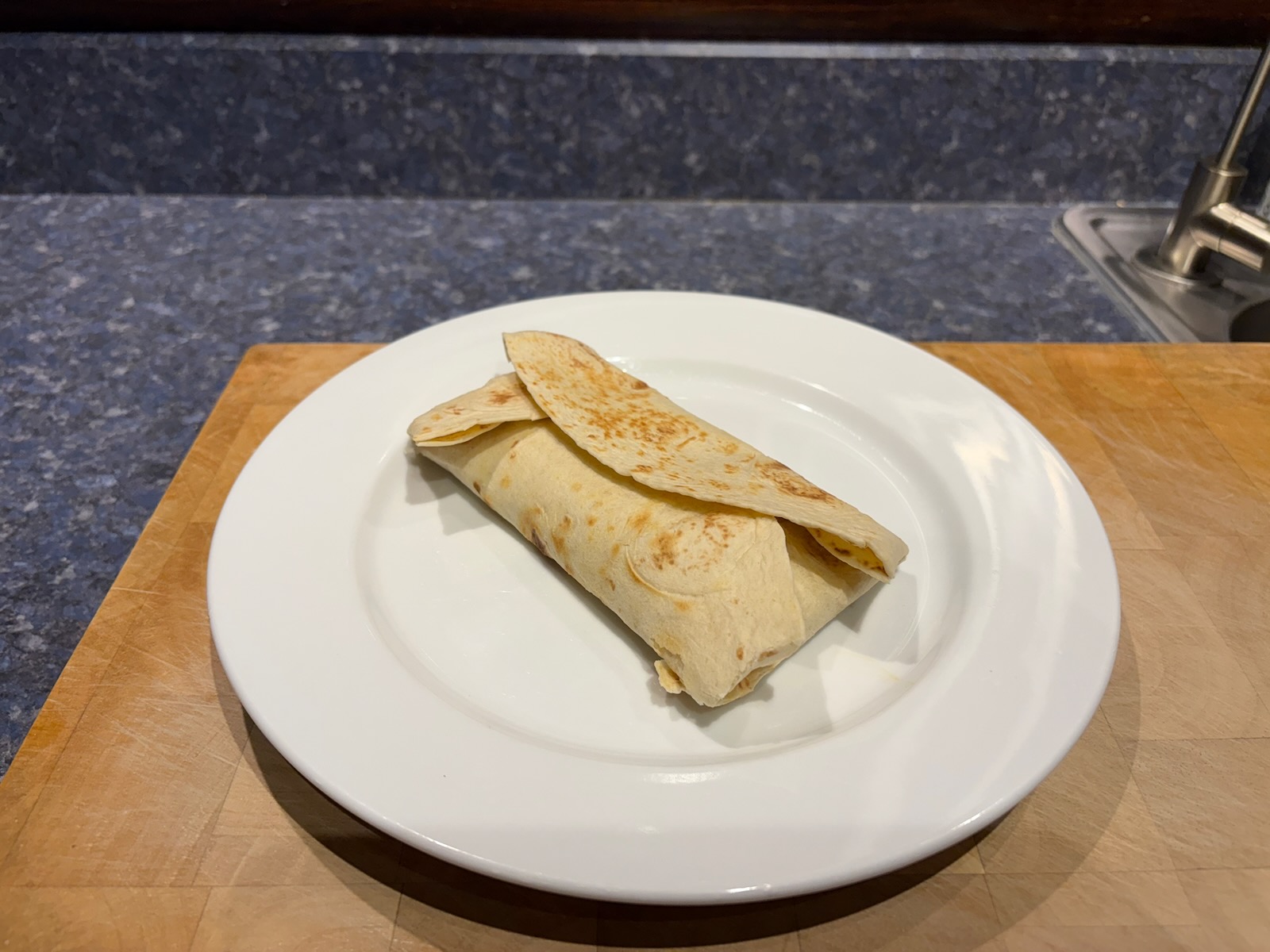 Breakfast: Chorizo breakfast burrito with chorizo, onion, green pepper, jalapeño, and egg. Reheat of the filling I cooked Saturday in a freshly heated flour tortilla.