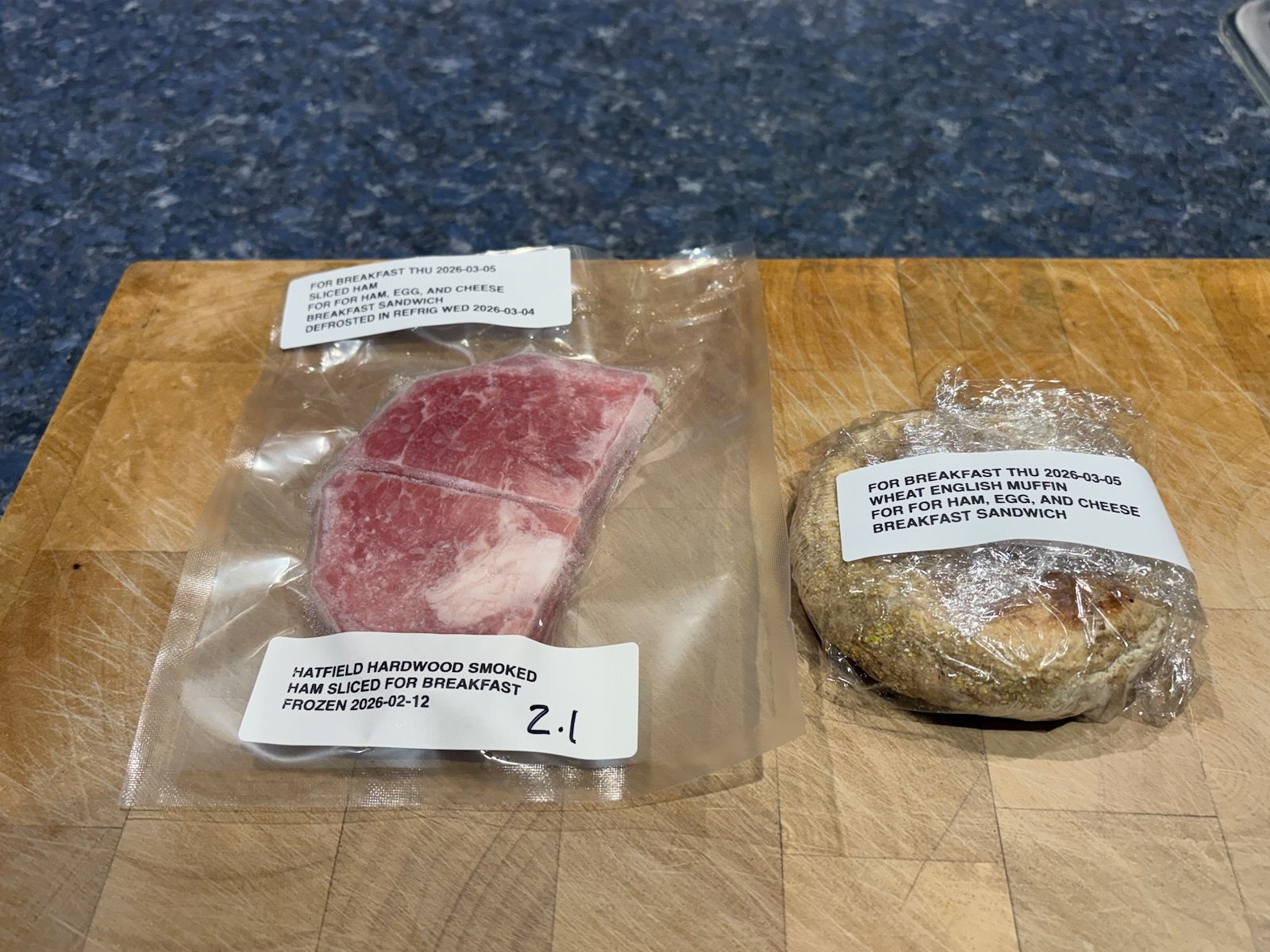 Defrosted ham and English muffin for ham, egg, and cheese tomorrow.