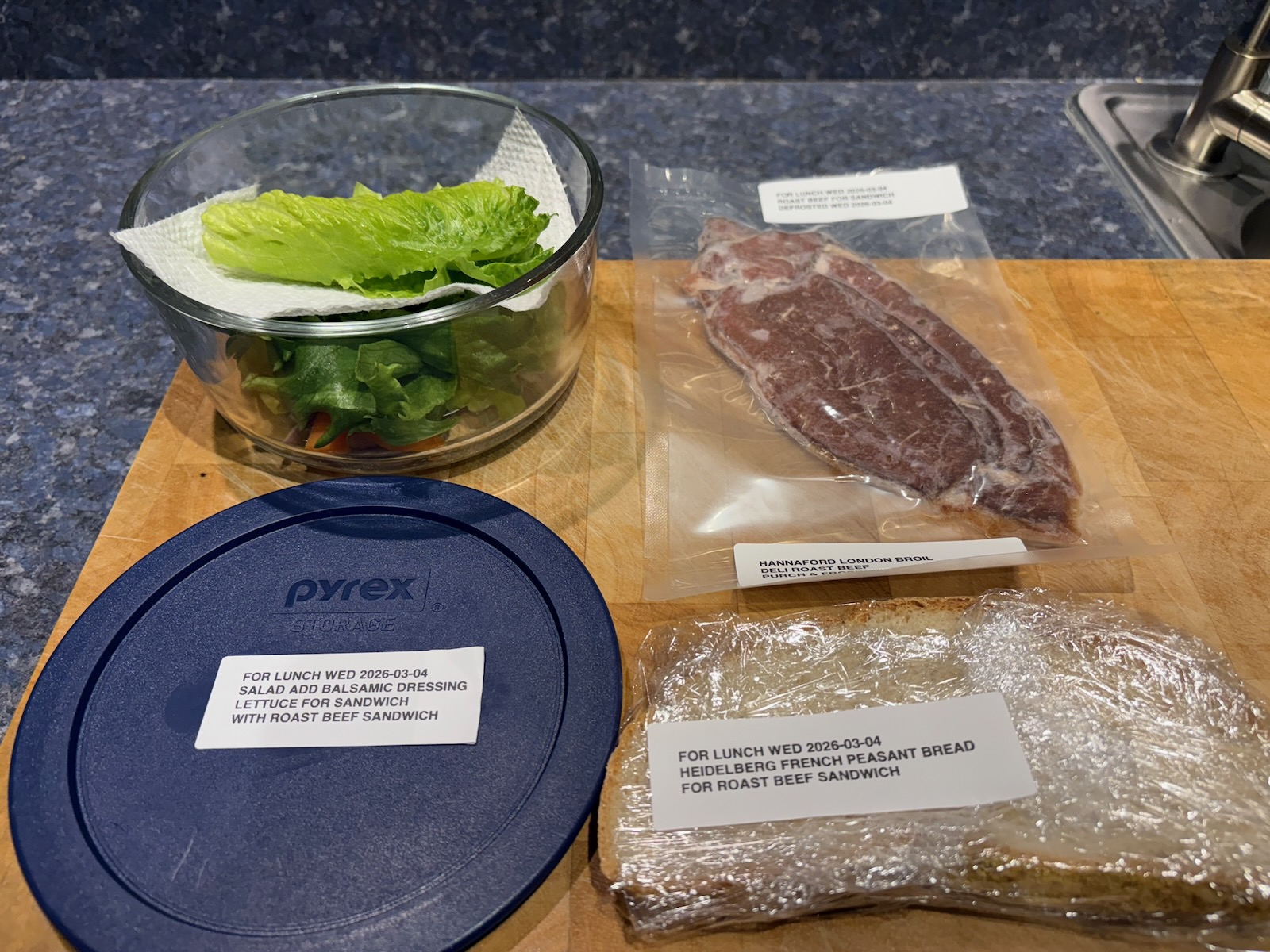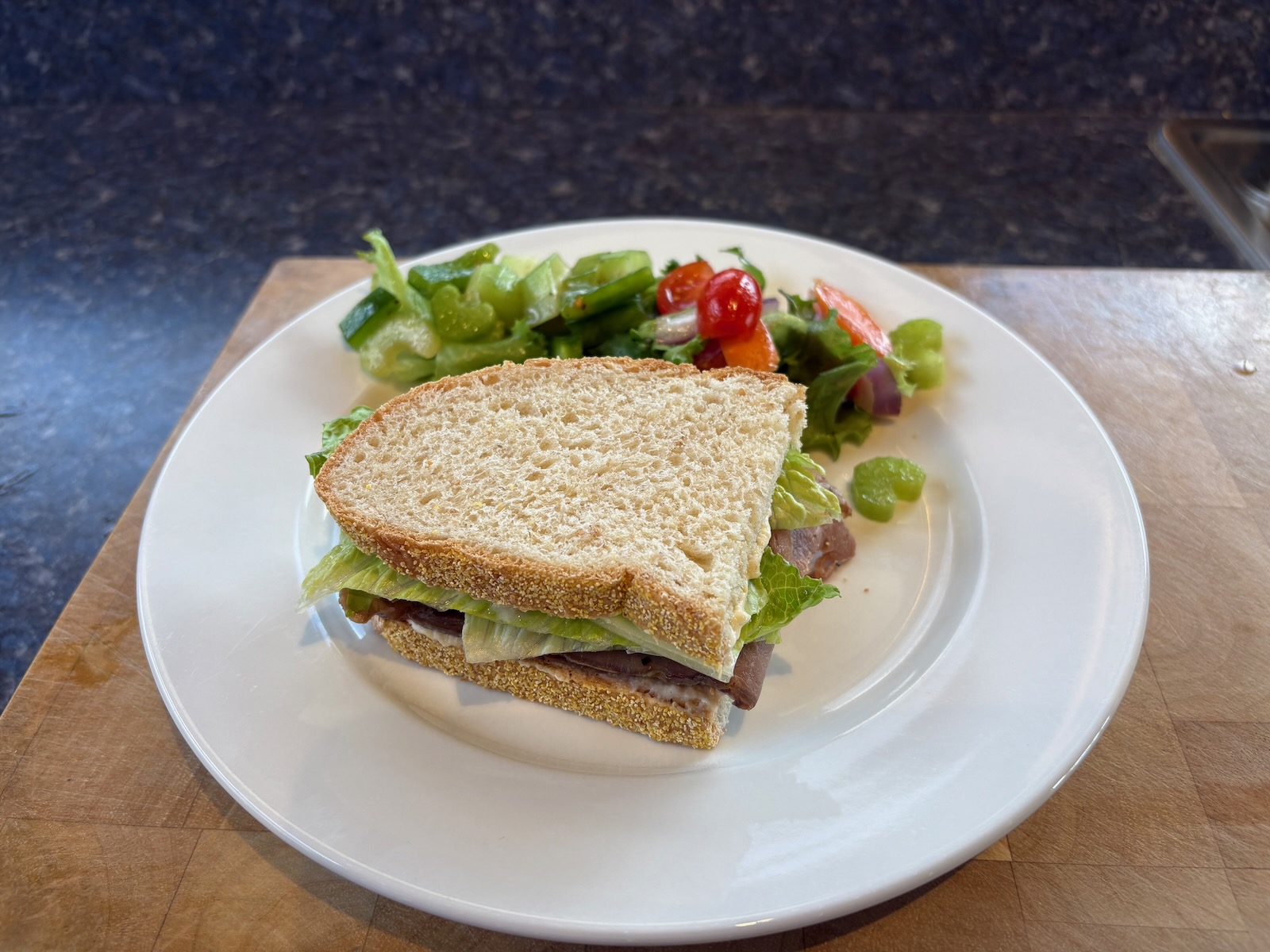 Lunch: Roast beef sandwich. With 2.4 oz. deli roast beef, lettuce, horseradish, and mayo on Heidelberg French peasant bread. Salad with lettuce mix, cucumber, tomato, carrot, celery, green pepper, red onion, and balsamic dressing.