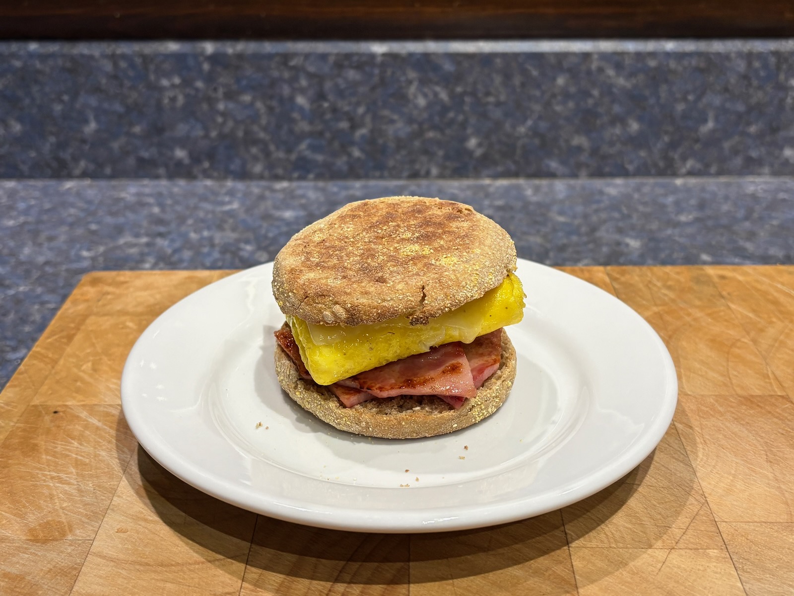 Breakfast: Ham, egg and cheese English muffin sandwich. With 2.1 oz. ham.