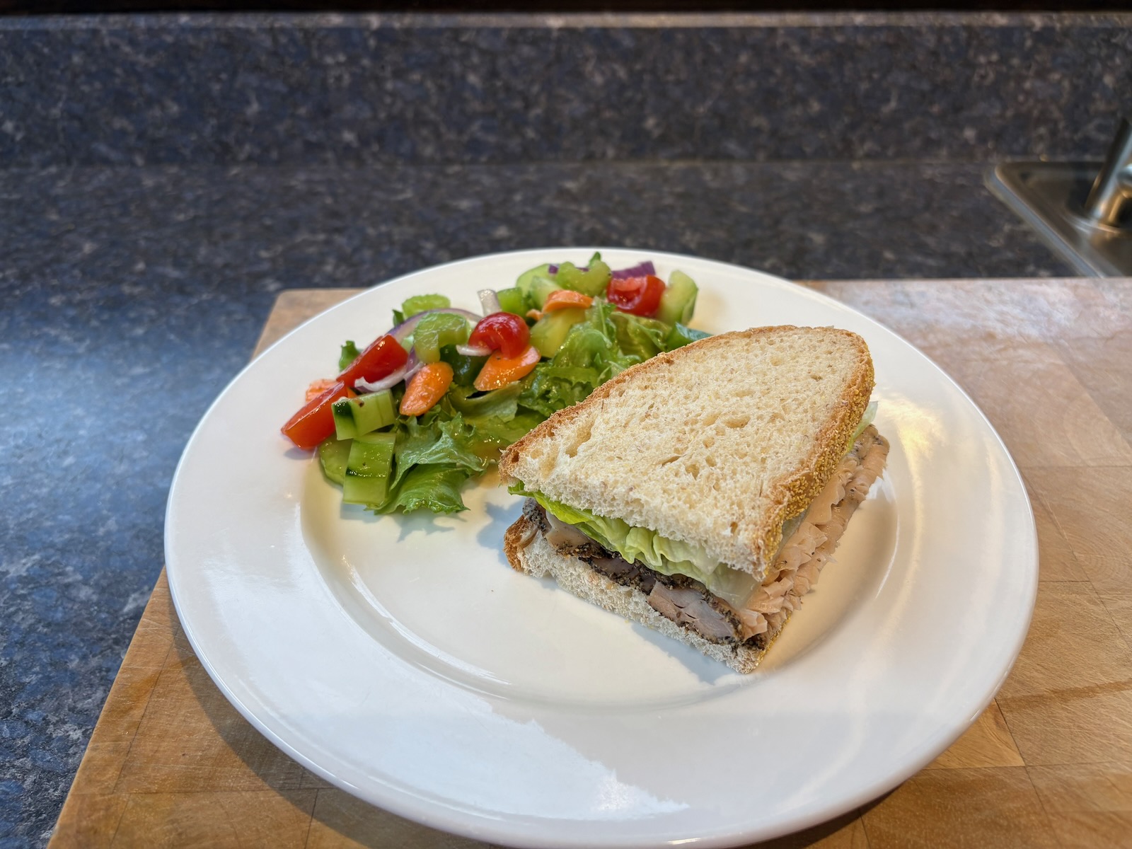 Lunch: Turkey sandwich with 2.1 oz. peppered deli turkey, lettuce, and mayo on Heidelberg French peasant bread. A side salad with lettuce mix, cucumber, tomato, celery, carrot, green pepper, red onion, and balsamic dressing.