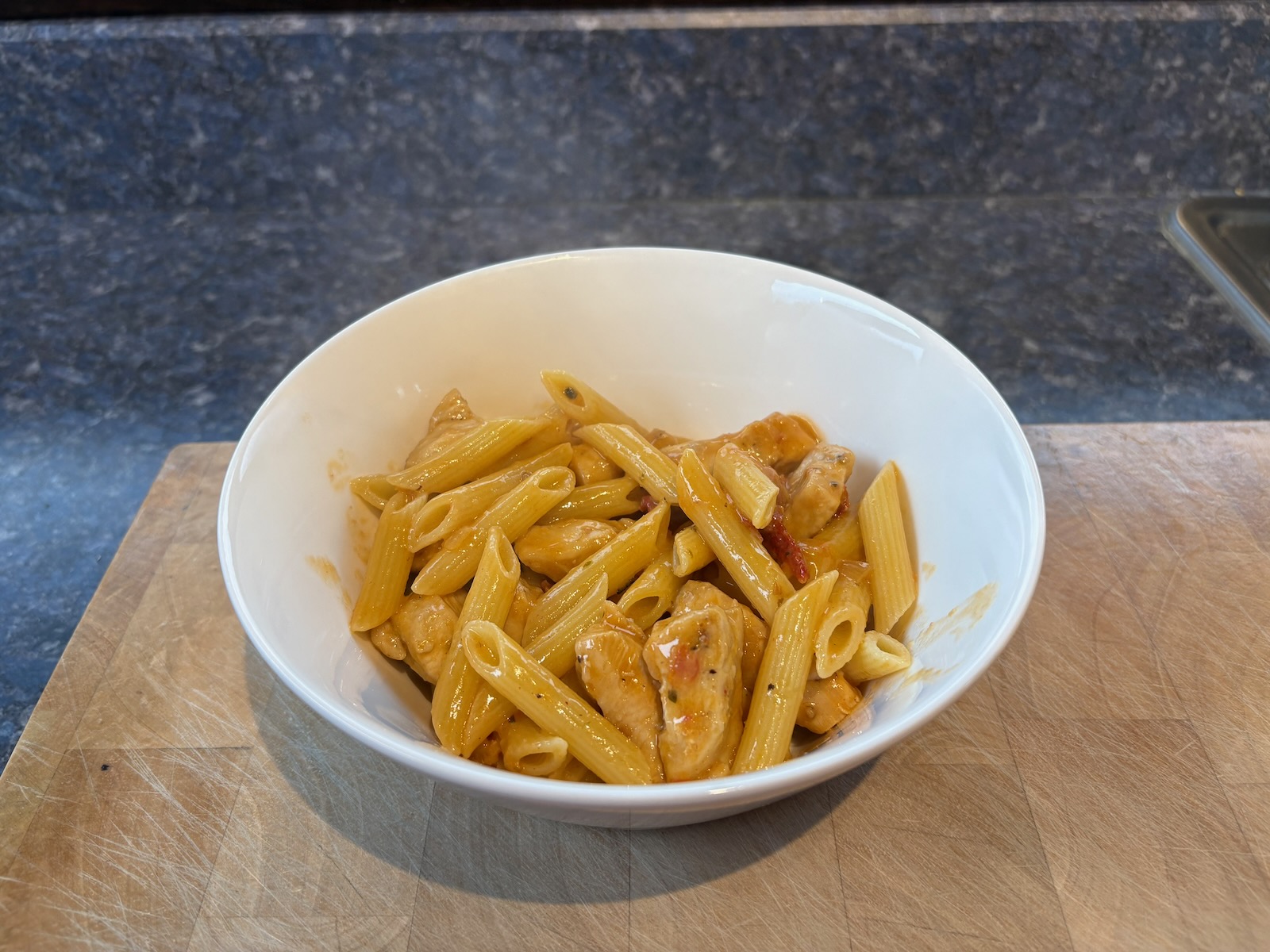 Dinner: Marry me chicken (6.5 oz). 1.8 oz. penne pasta. A glass of Bota Box pinot noir.