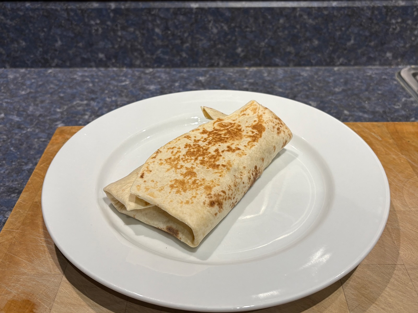 Breakfast: Chorizo breakfast burrito with chorizo, onion, green pepper, jalapeño, and egg. Reheat of the filling I cooked Saturday in a freshly heated flour tortilla.