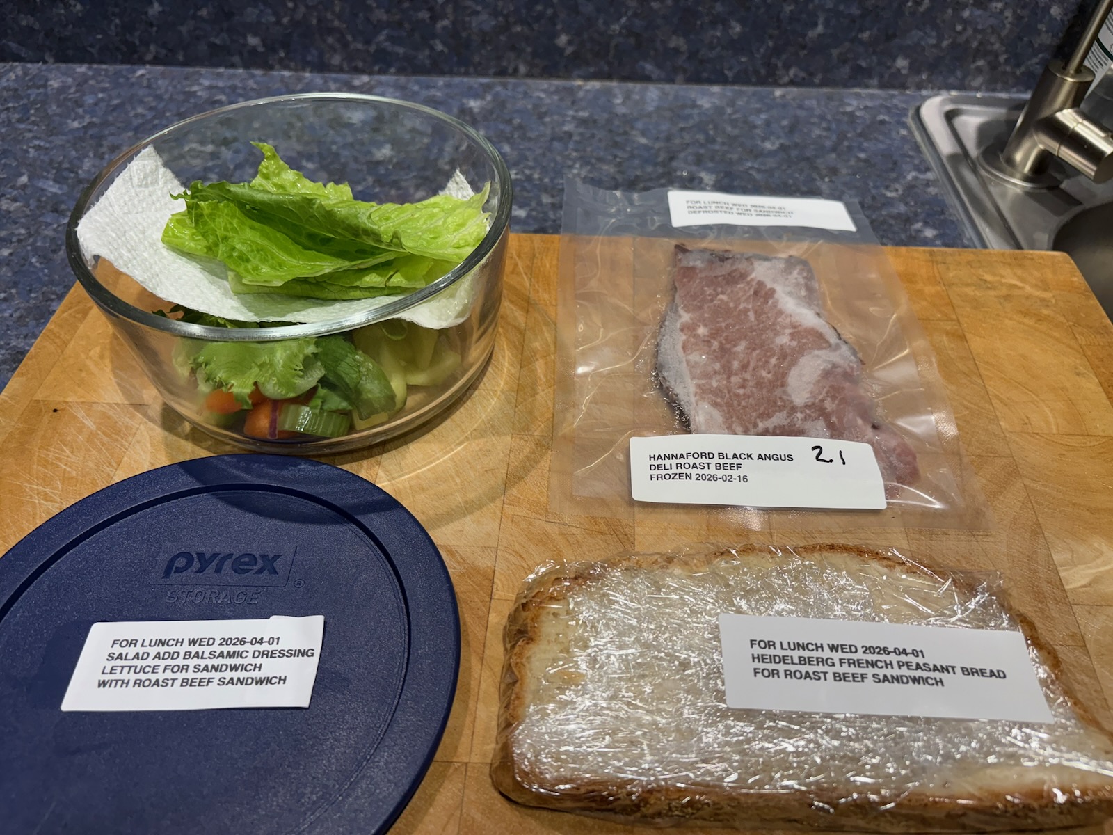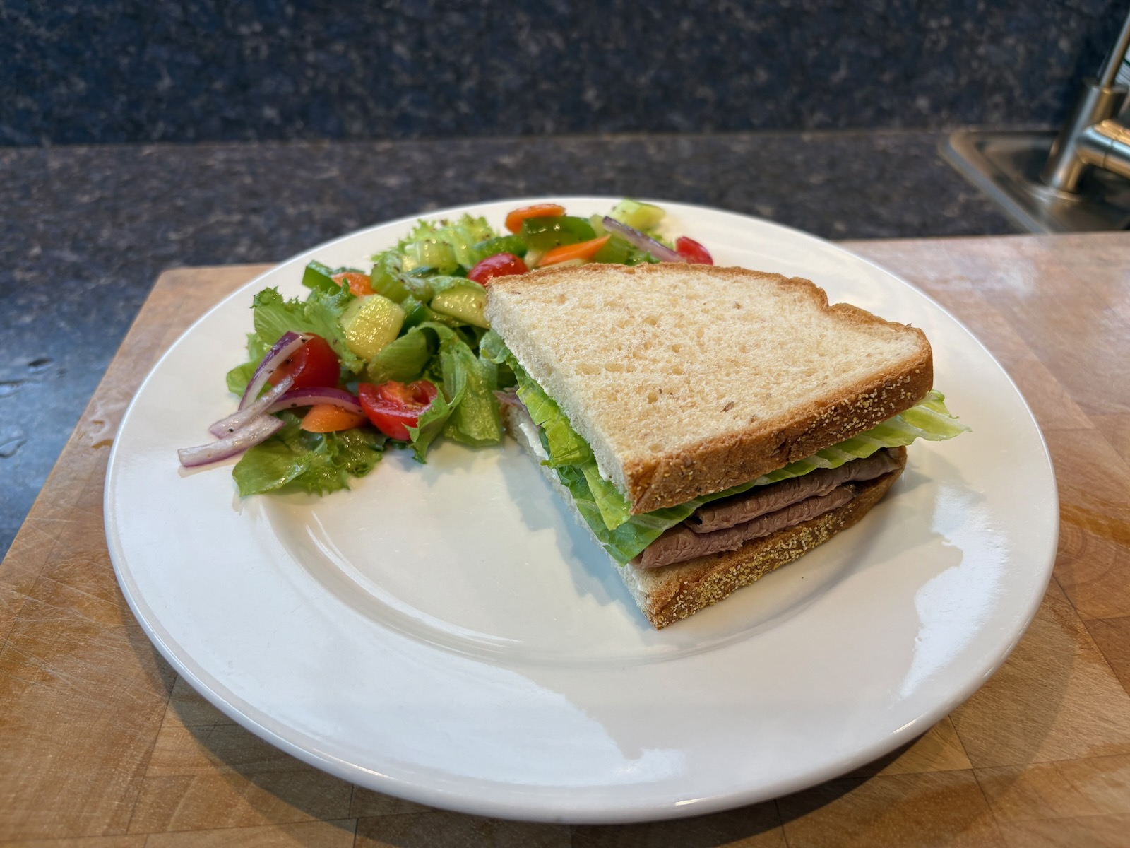 Lunch: Roast beef sandwich. With 2.1 oz. deli roast beef, lettuce, horseradish, and mayo on Heidelberg French peasant bread. Salad with lettuce mix, cucumber, tomato, carrot, celery, green pepper, red onion, and balsamic dressing.