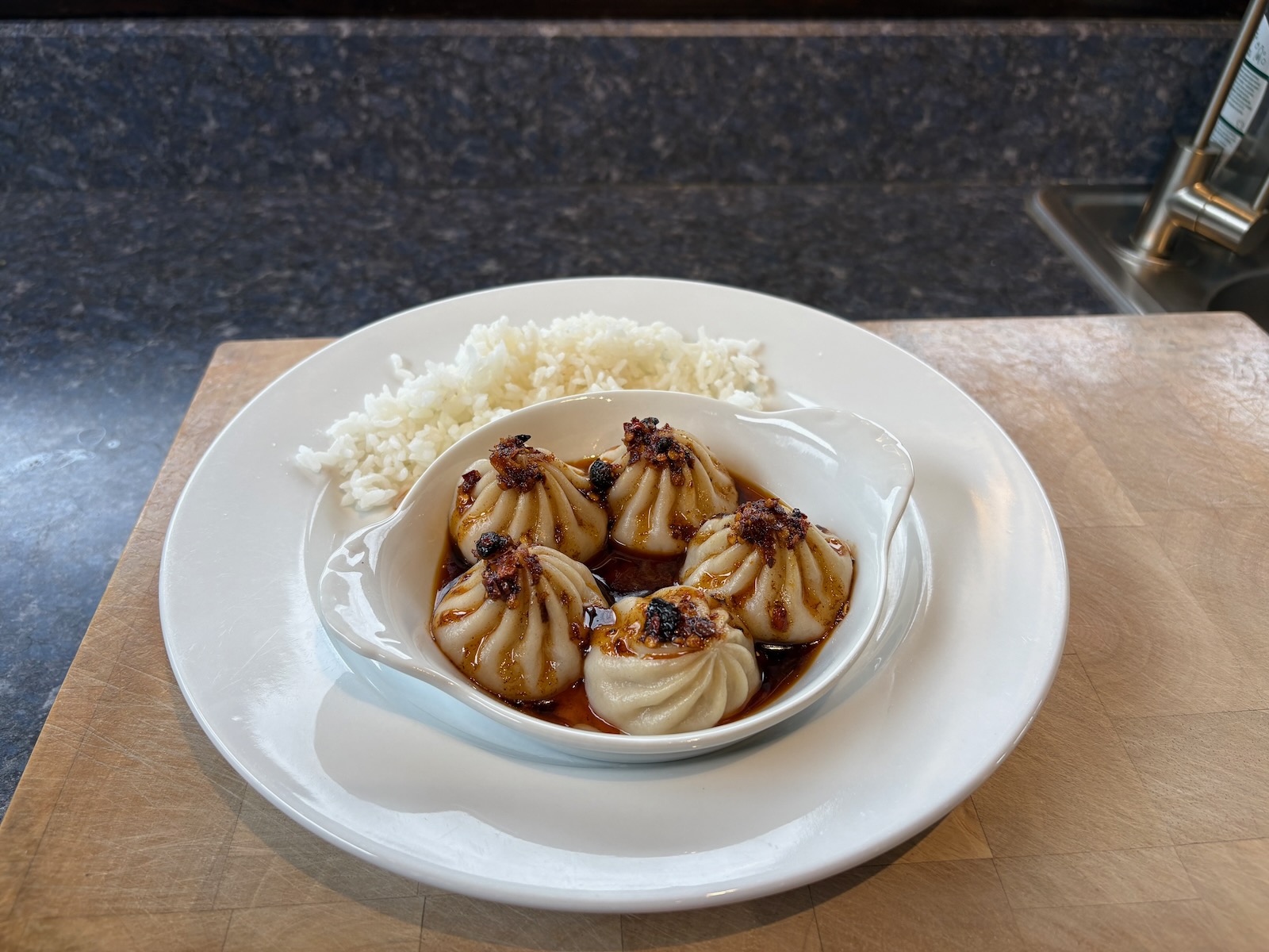 Dinner: MìLà Dumplings (5). Rice. A half glass of Bota Box sauvignon blanc.