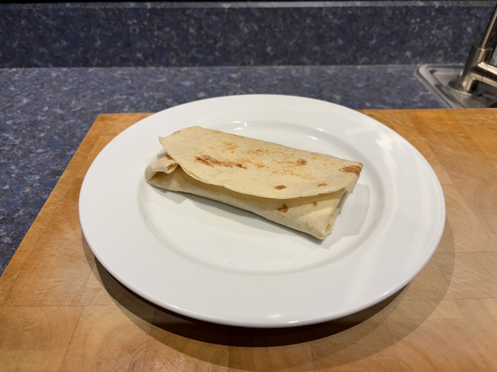 Breakfast: Chorizo breakfast burrito with chorizo, onion, green pepper, jalapeƱo, and egg. Reheat of the filling I cooked Saturday and froze, in a freshly heated flour tortilla.
