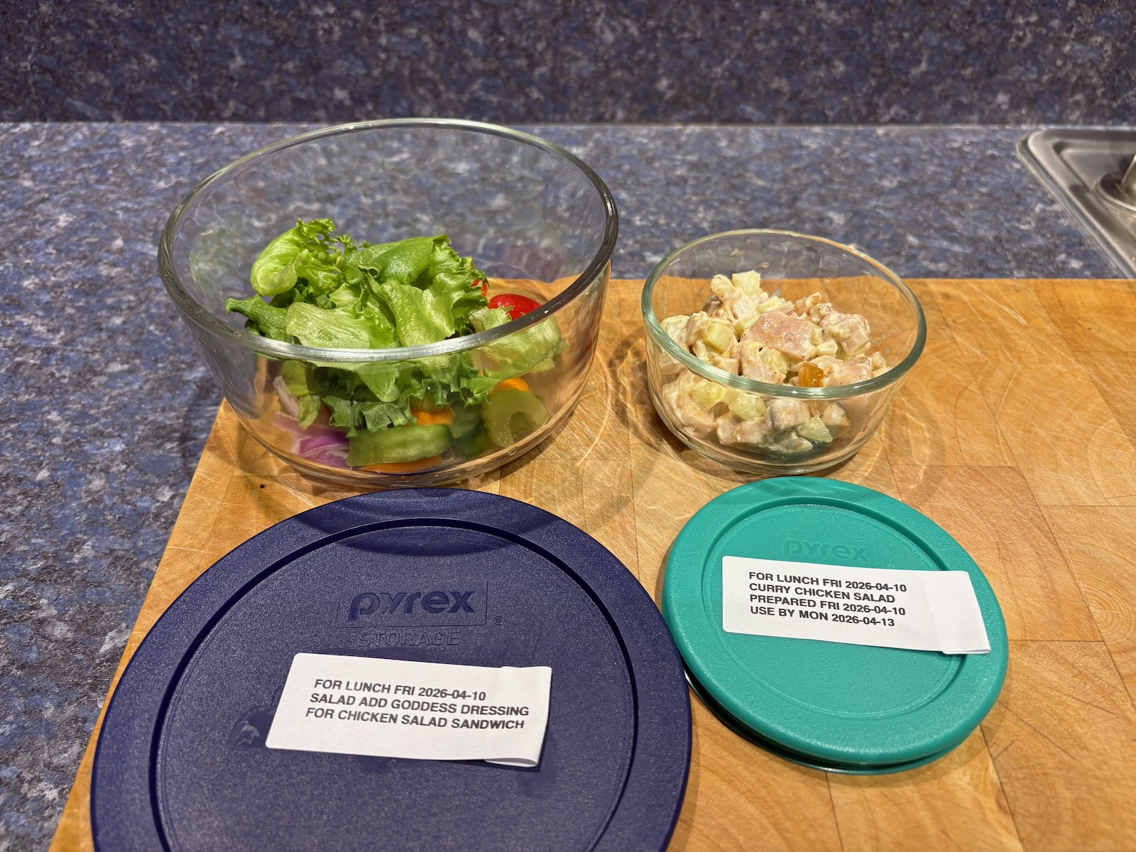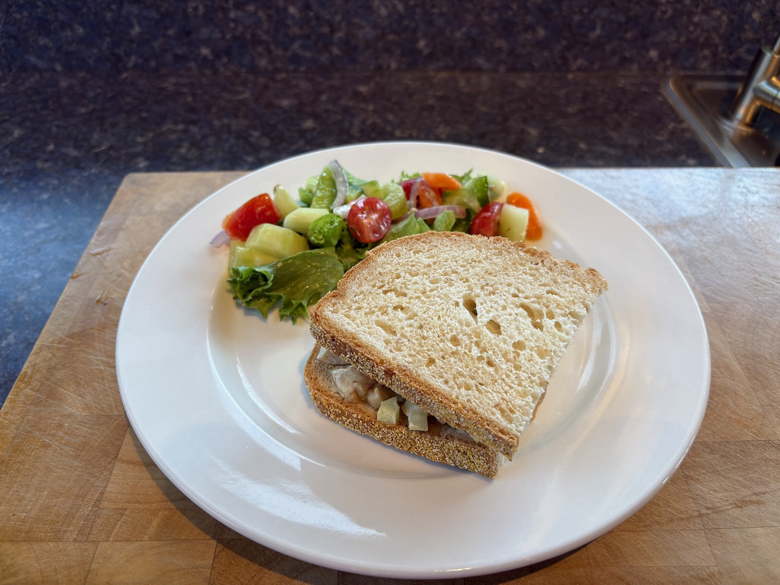Lunch: Curry chicken salad sandwich with 2.0 oz. chicken on Heidelberg French peasant bread. Side salad with lettuce mix, carrot, celery, green pepper, red onion, cucumber, tomato, and Annie's green goddess dressing.