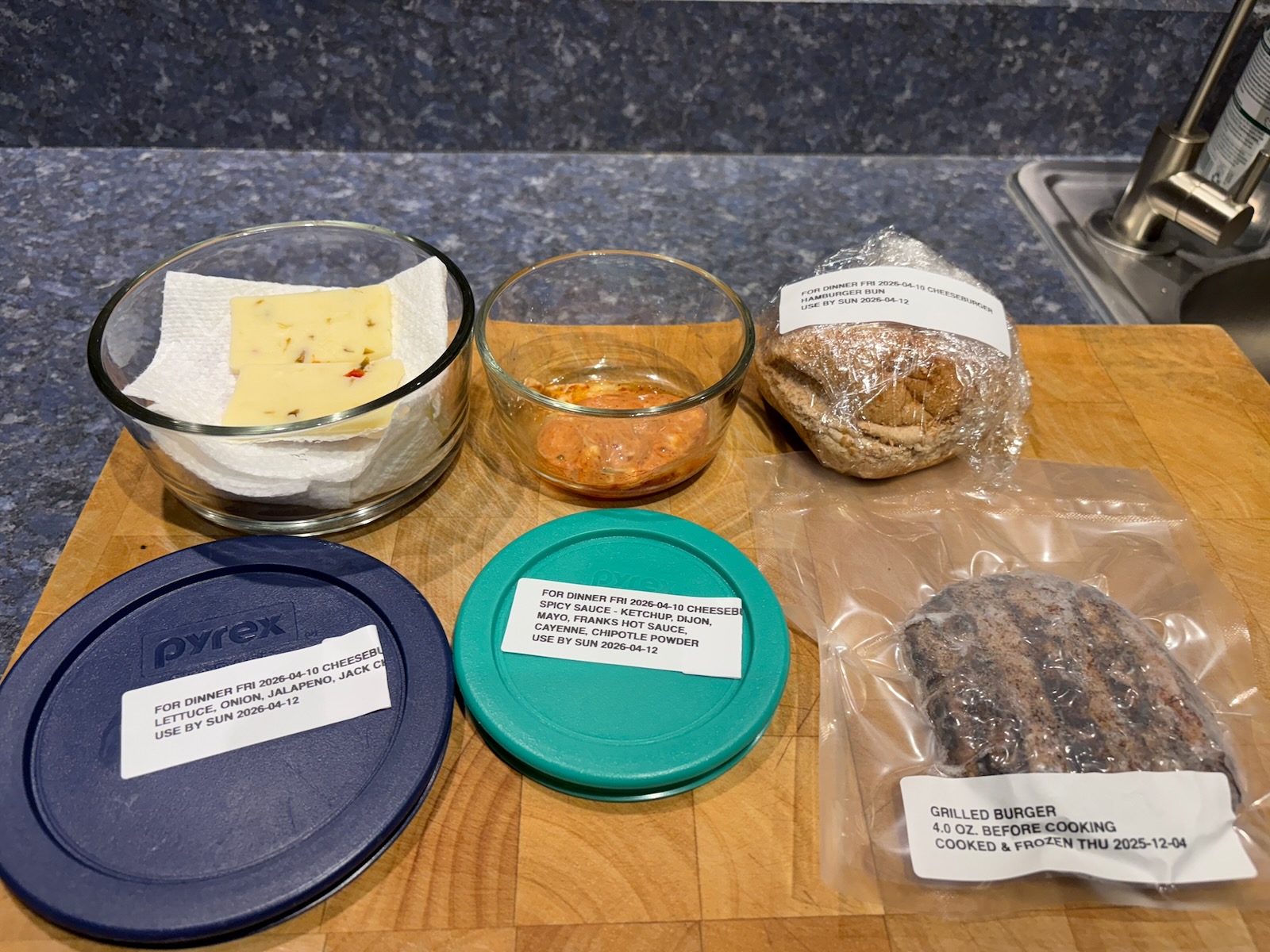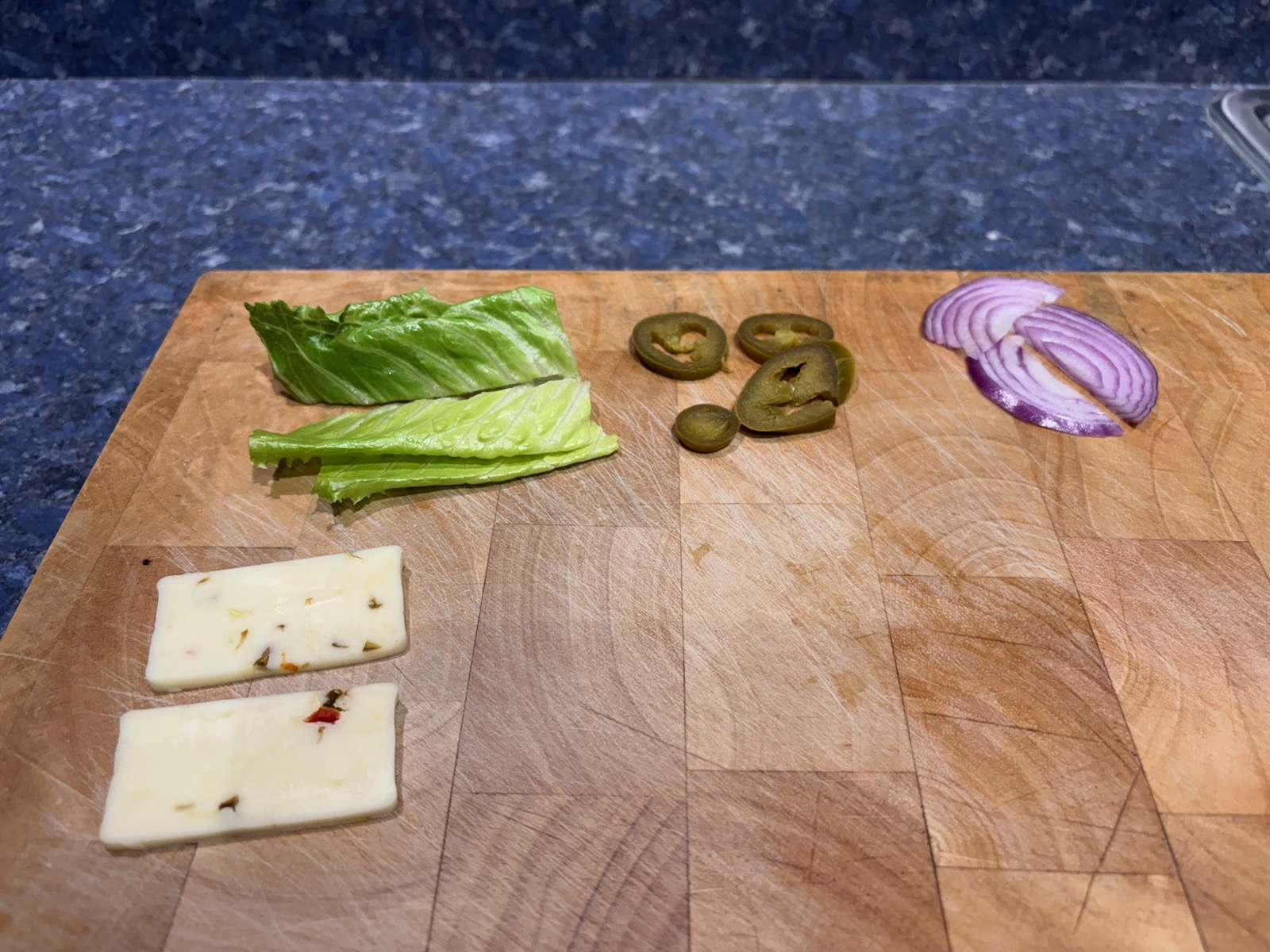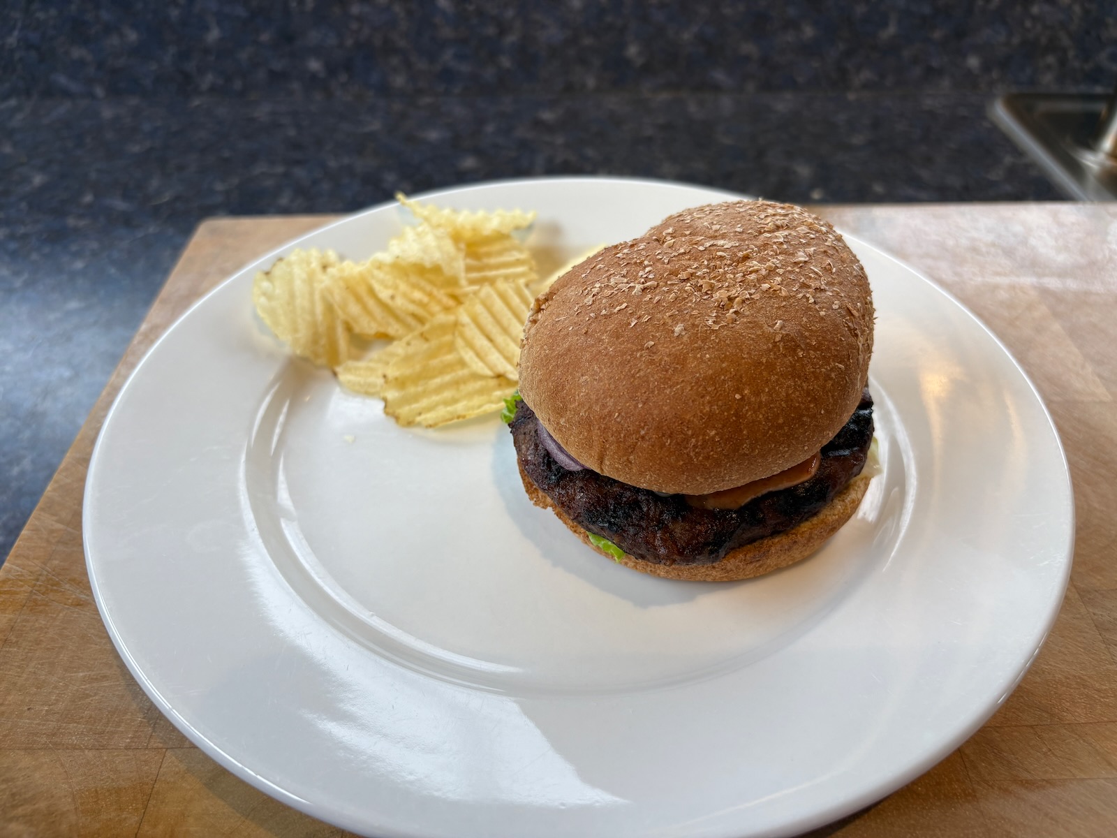 Dinner: Cheeseburger. 4.0 oz beef before cooking, with pepper jack cheese, lettuce, pickled jalapeƱos, red onion, and spicy sauce. A few potato chips.