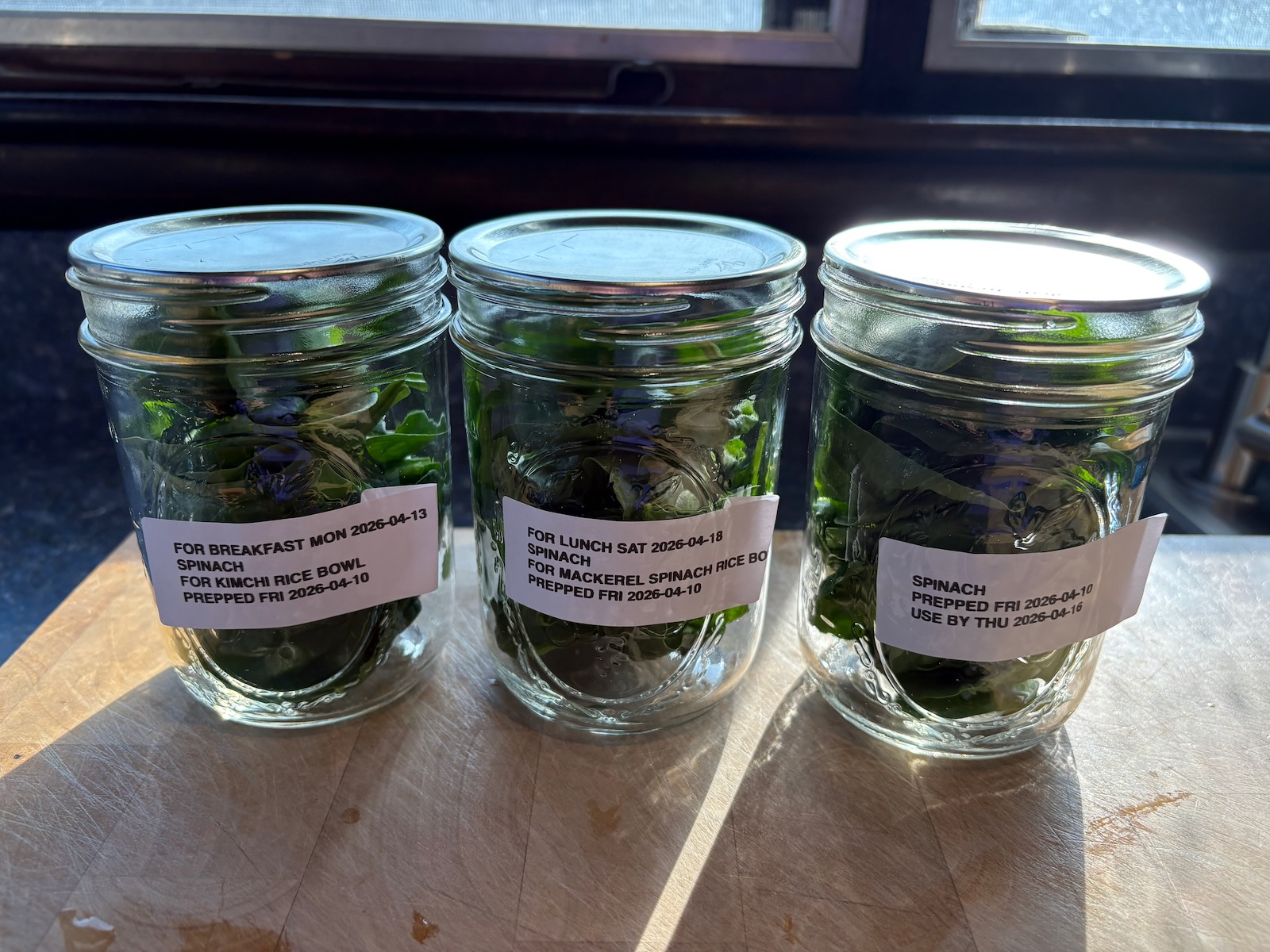 Prepped, vacuum sealed, and refrigerated jars of spinach.