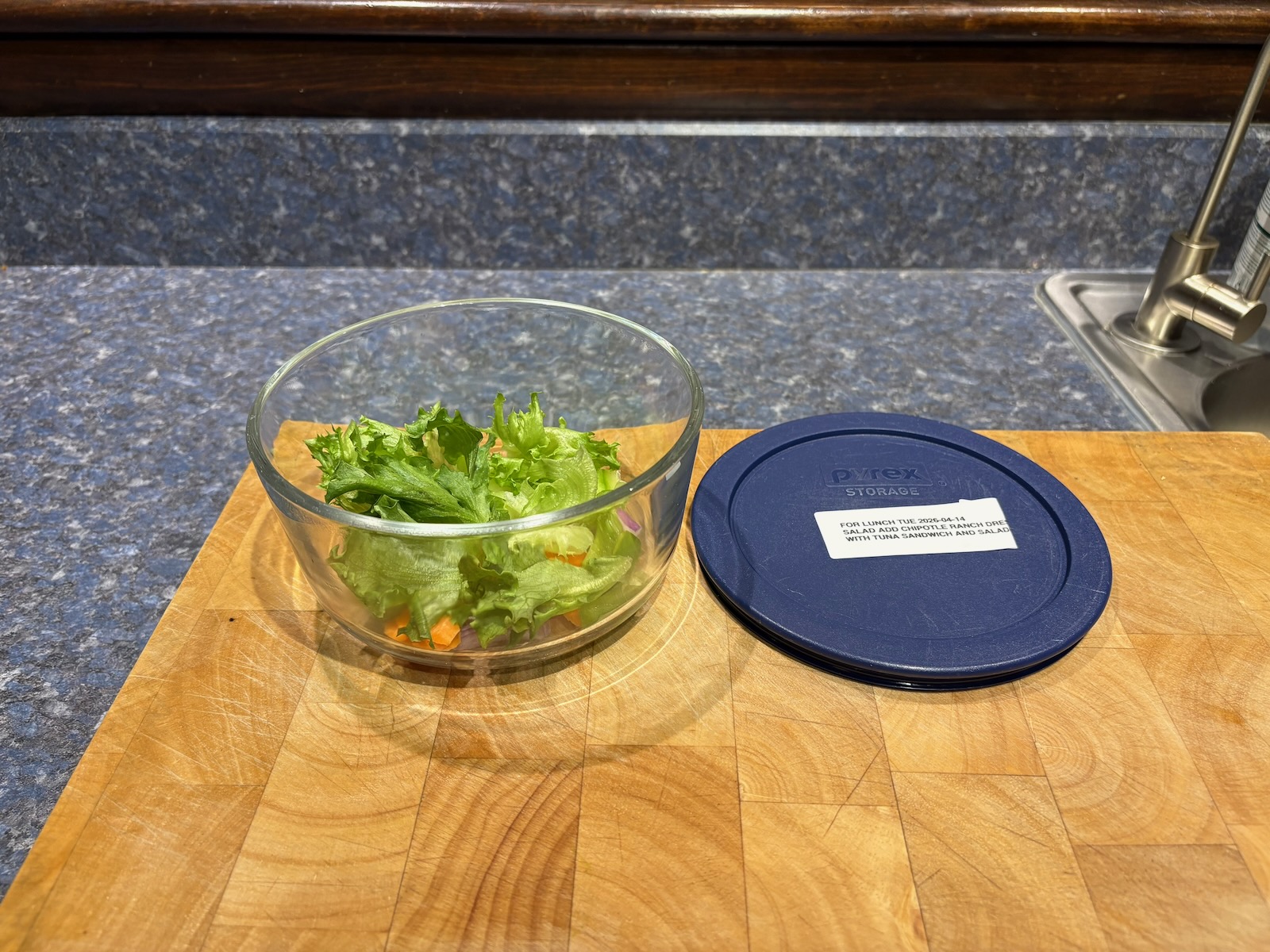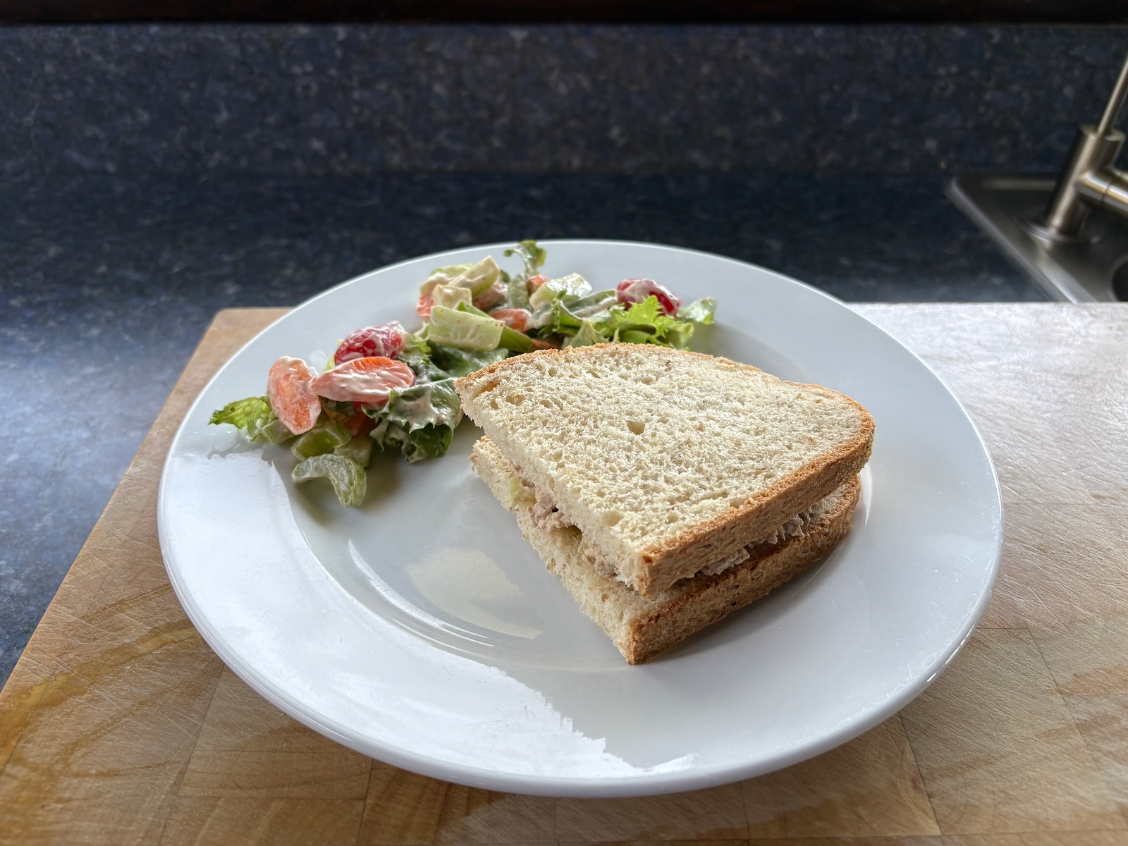 Lunch: Spicy tuna salad sandwich on Heidelberg French peasant bread. Salad with lettuce mix, cucumber, tomato, carrot, celery, green pepper, red onion, and chipotle ranch dressing (20 grams, 93 cal).