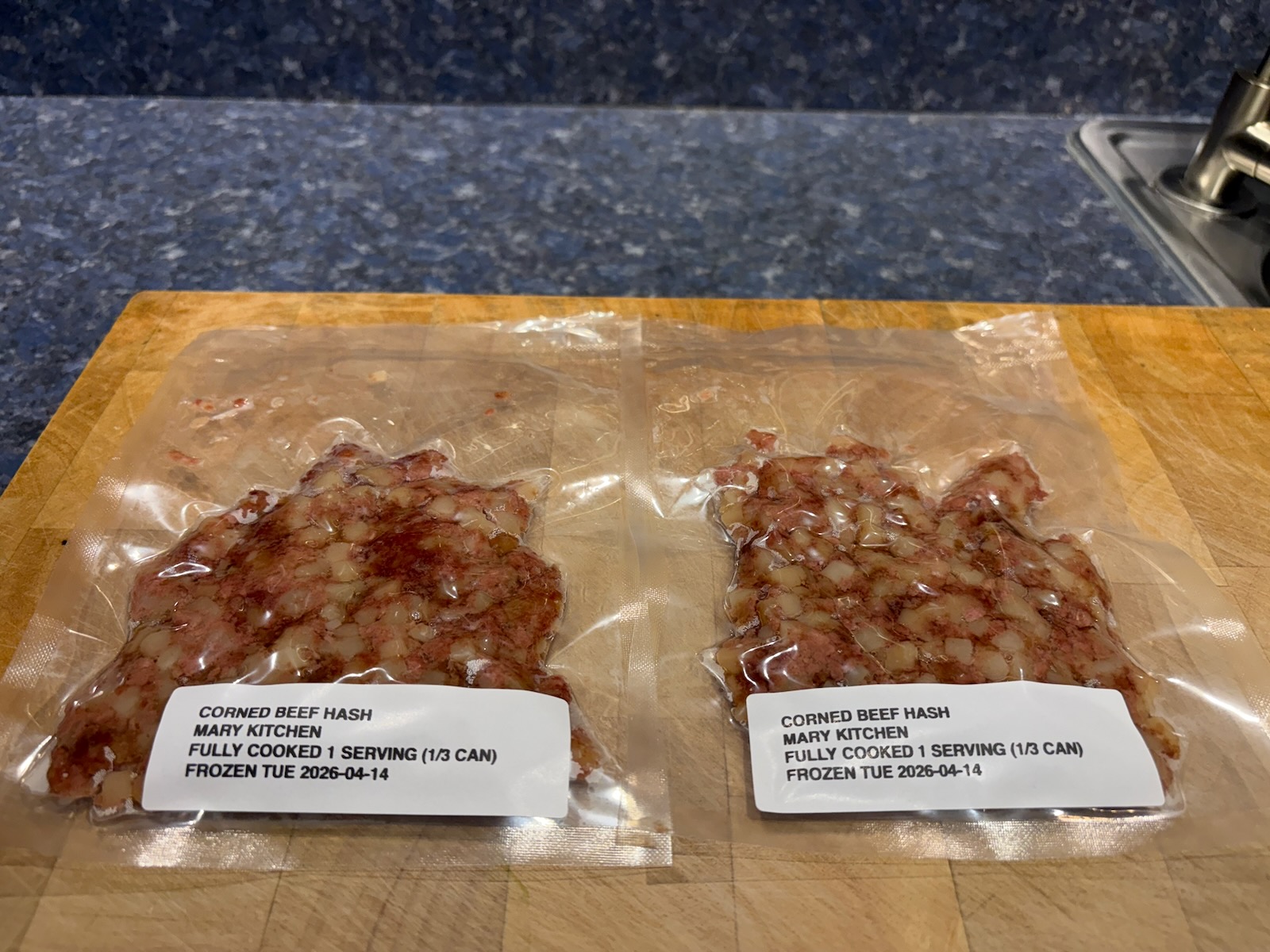 Vacuum sealed and froze the two additional servings of corned beef hash.