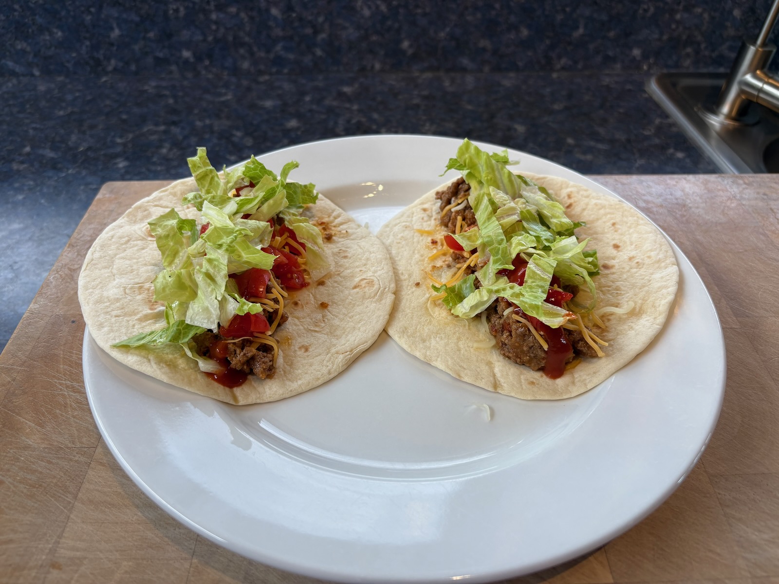 Dinner: American-style beef soft taco. With 3.0 oz. taco seasoned ground beef, cheese, tomato, hot taco sauce, and lettuce.