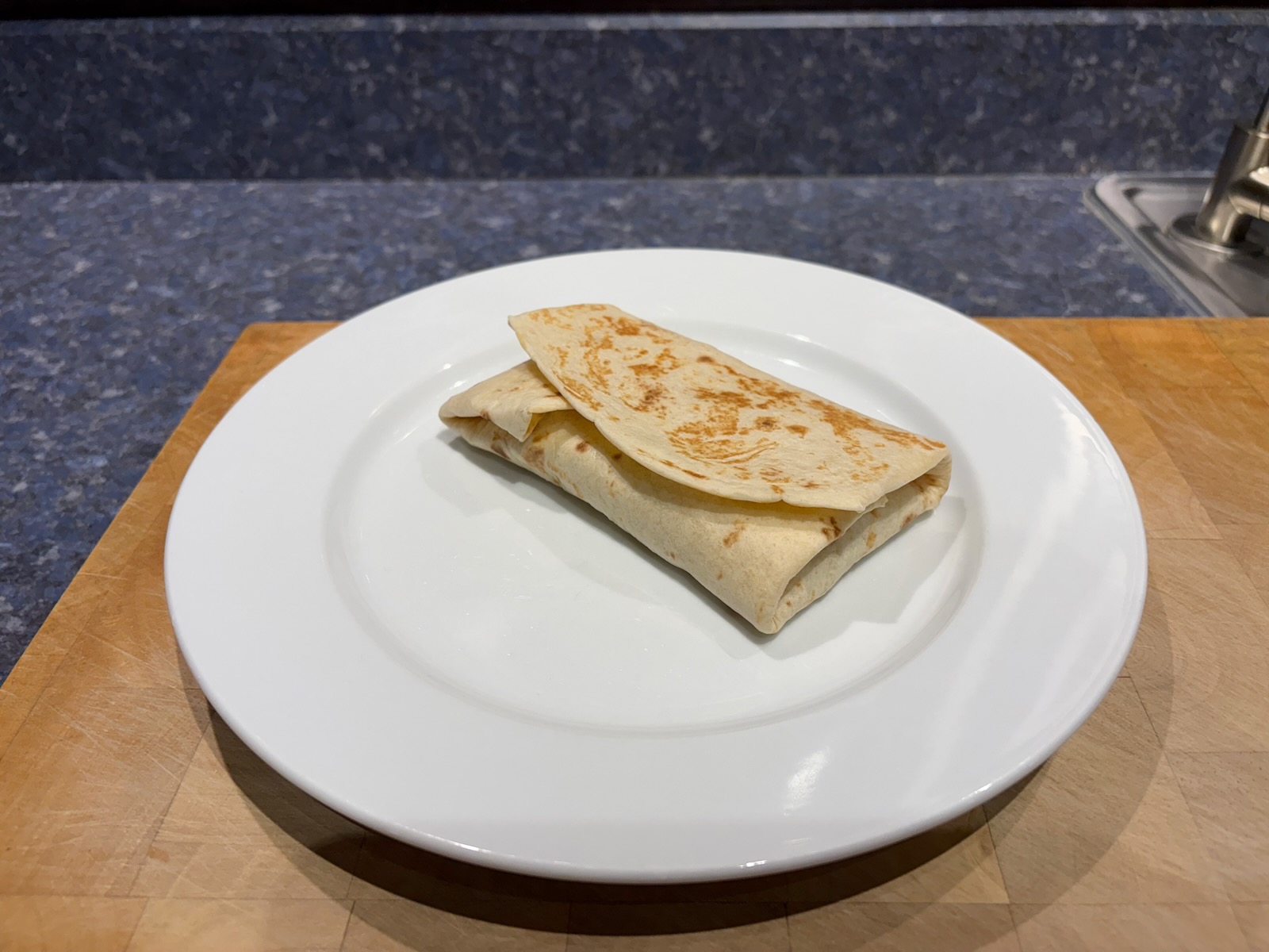 Breakfast: Chorizo breakfast burrito with chorizo, onion, green pepper, jalapeƱo, and egg. Reheat of the filling I cooked Saturday in a freshly heated flour tortilla.