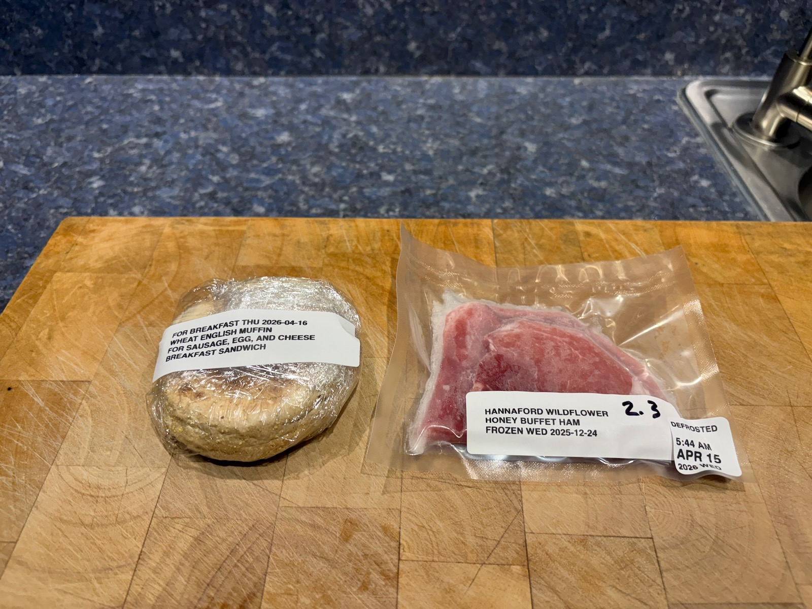 Defrosted ham and English muffin for ham, egg, and cheese tomorrow.