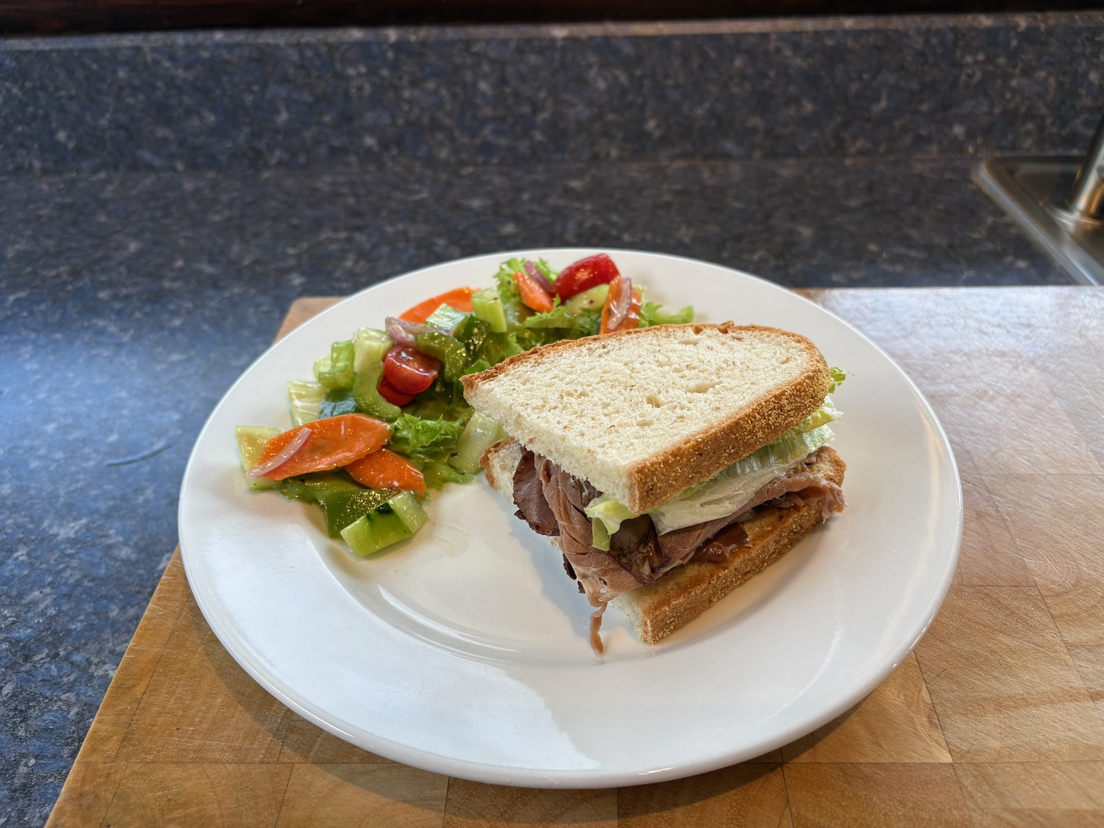 Lunch: Roast beef sandwich. With 2.3 oz. deli roast beef, lettuce, horseradish, and mayo on Heidelberg French peasant bread. Salad with lettuce mix, cucumber, tomato, carrot, celery, green pepper, red onion, and balsamic dressing.