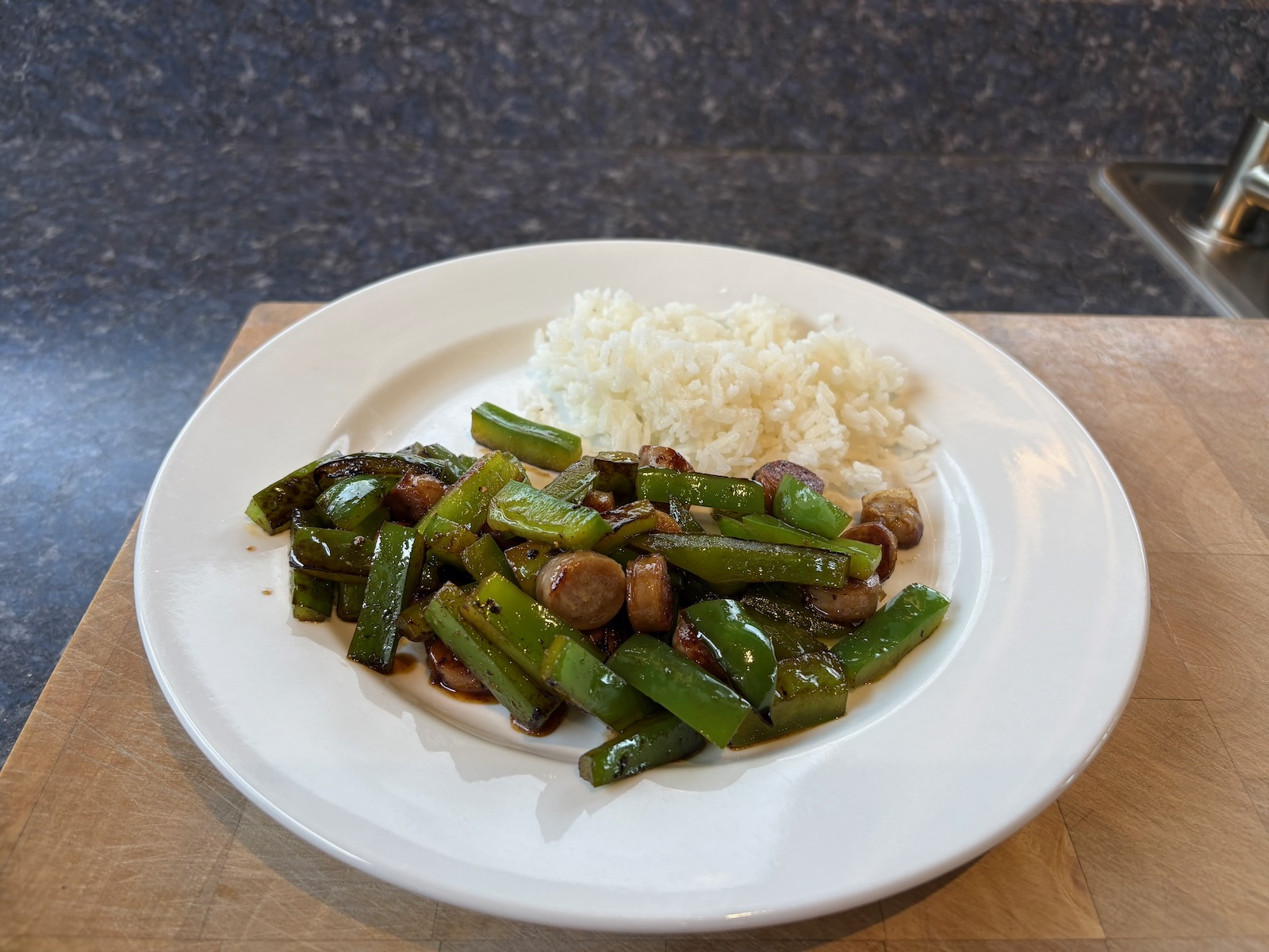 Dinner: Sausage and green pepper stir-fry. Rice.