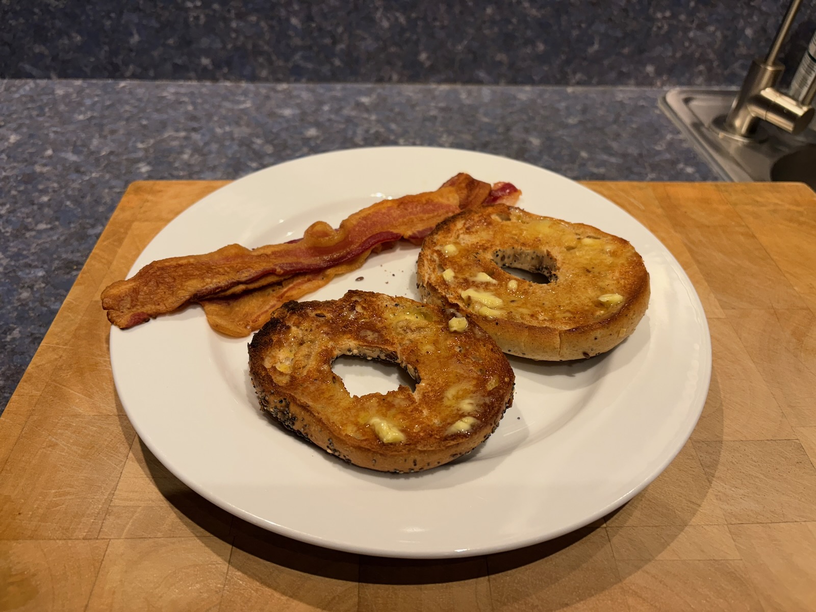 Breakfast: Toasted everything bagel with butter. Side of bacon.