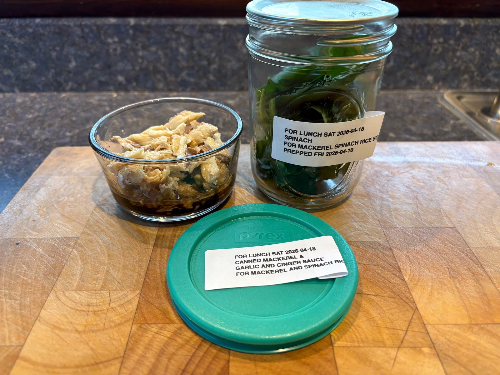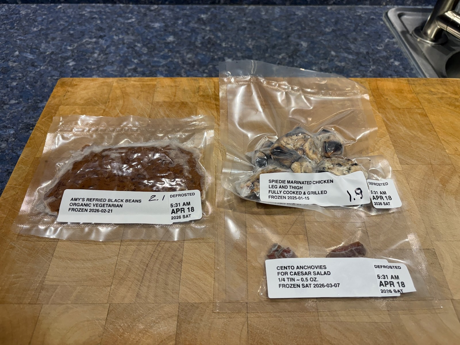 Defrosted refried black beans for breakfast tomorrow. Also chicken and anchovies for Caesar salad tomorrow.