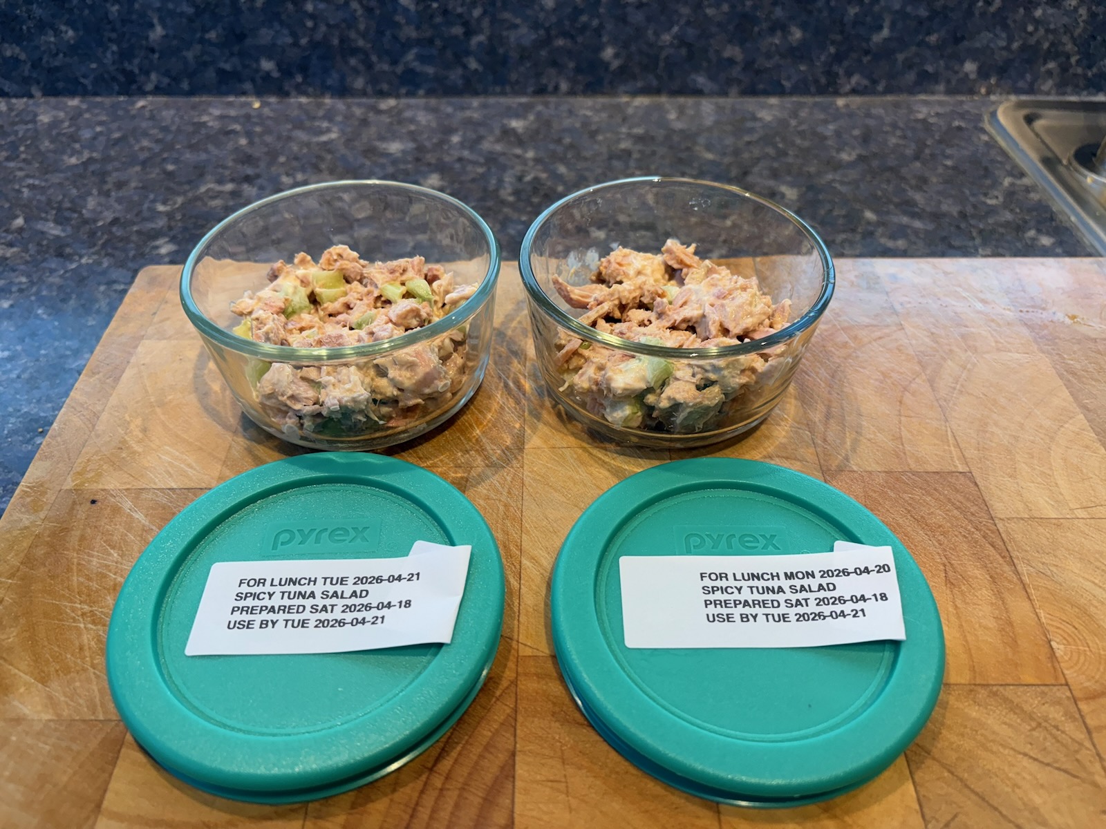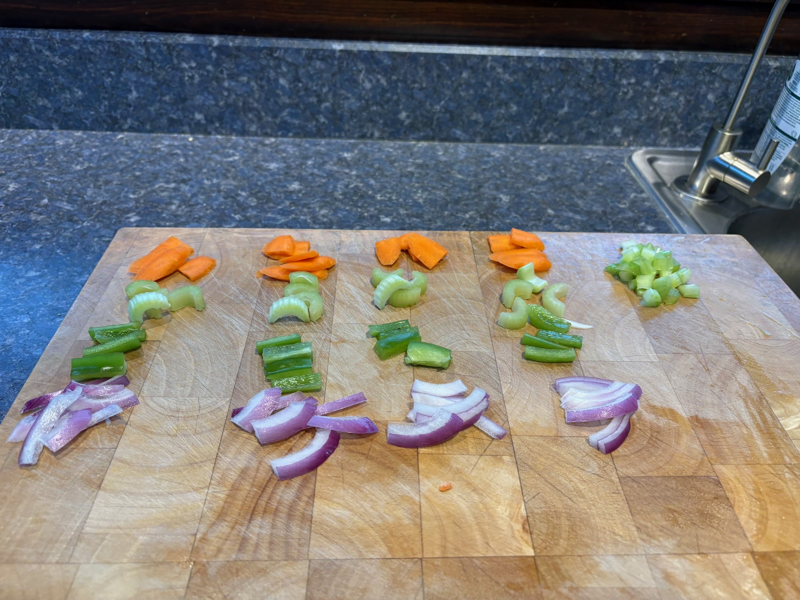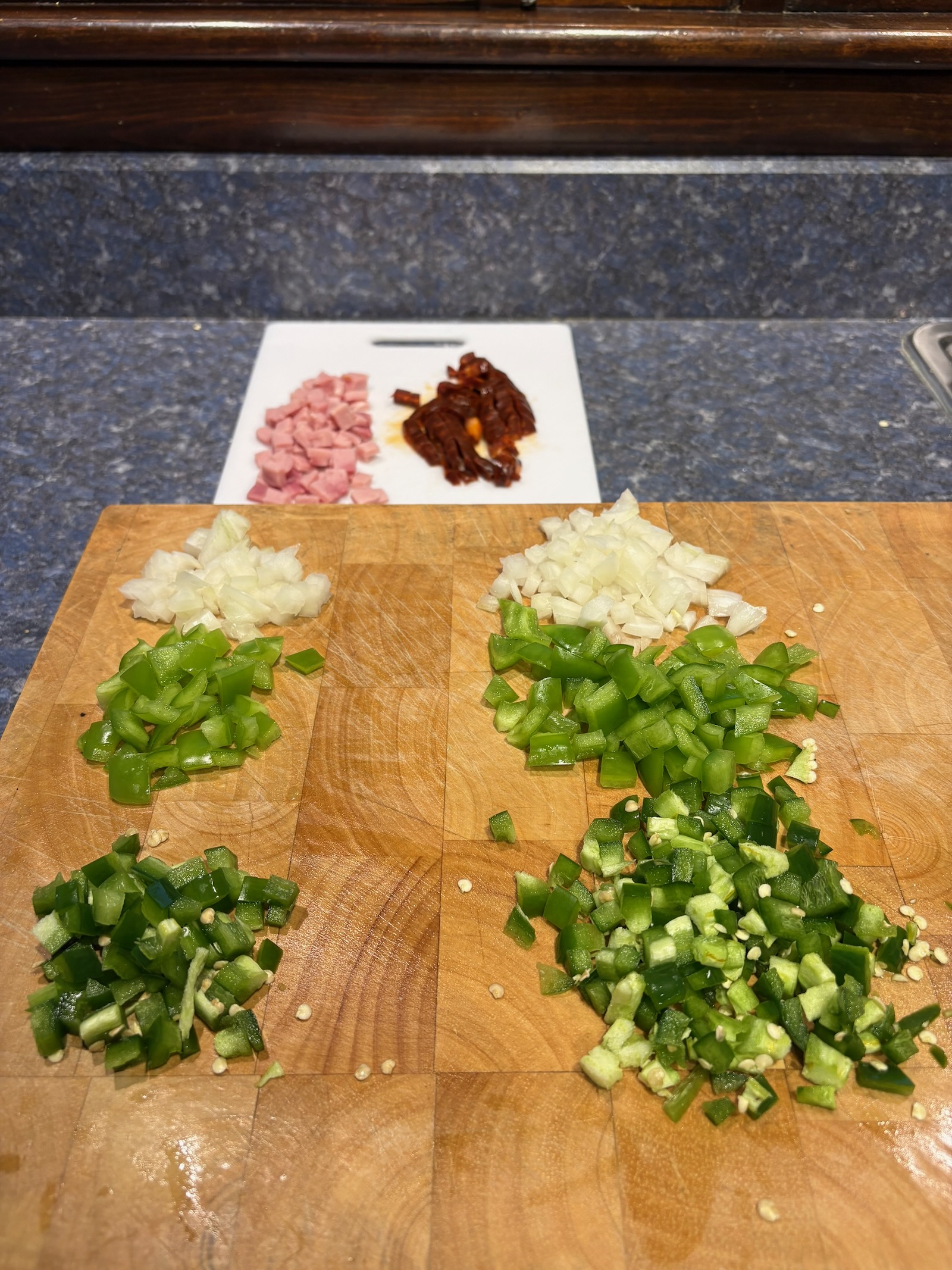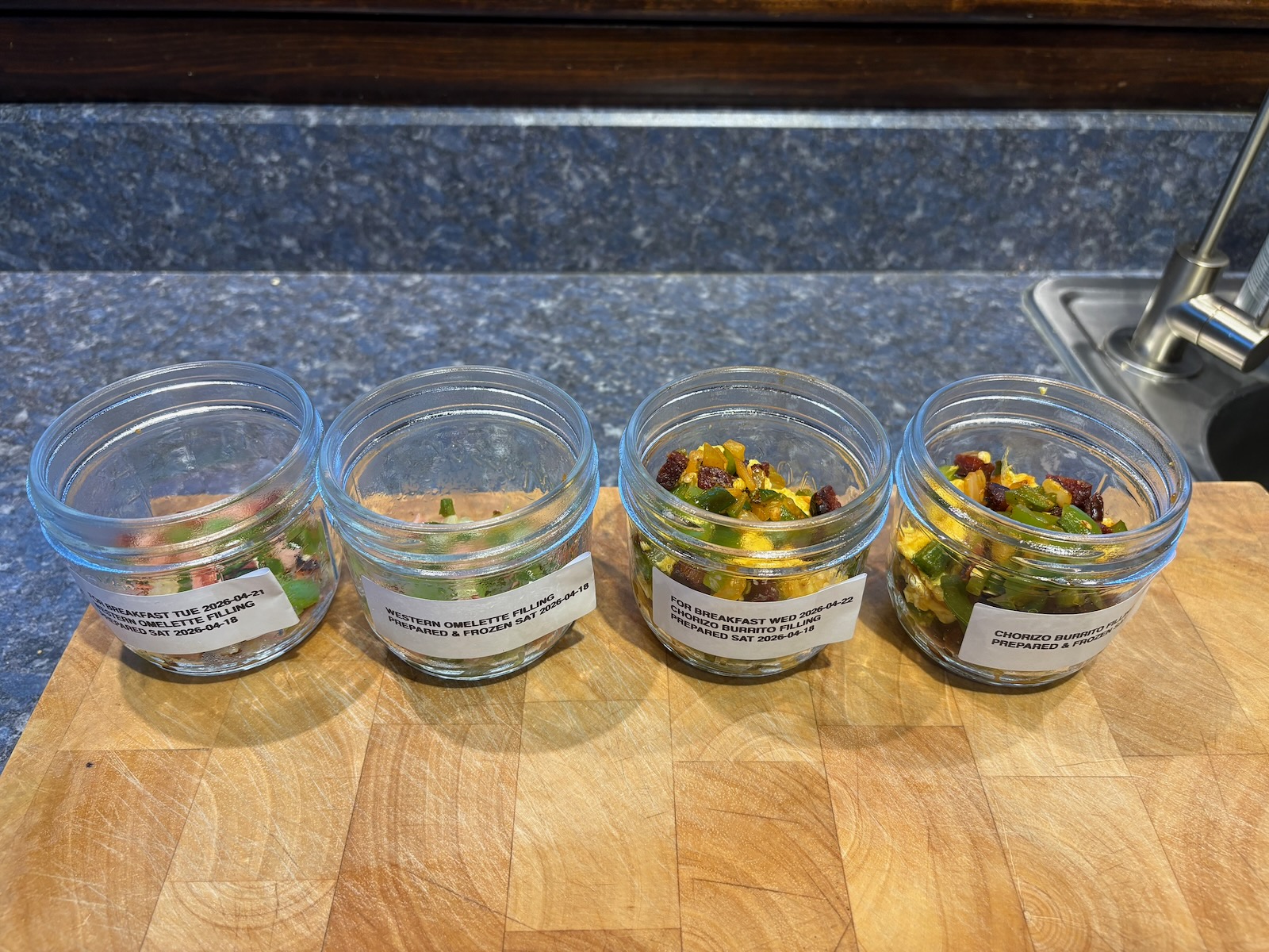 Made the filling for an spicy western omelette for Tuesday and froze one more serving. Make the filling for chorizo breakfast burrito with chorizo, onion, green pepper, jalapeƱo, and egg for breakfast Wednesday. Froze the serving for next Friday.