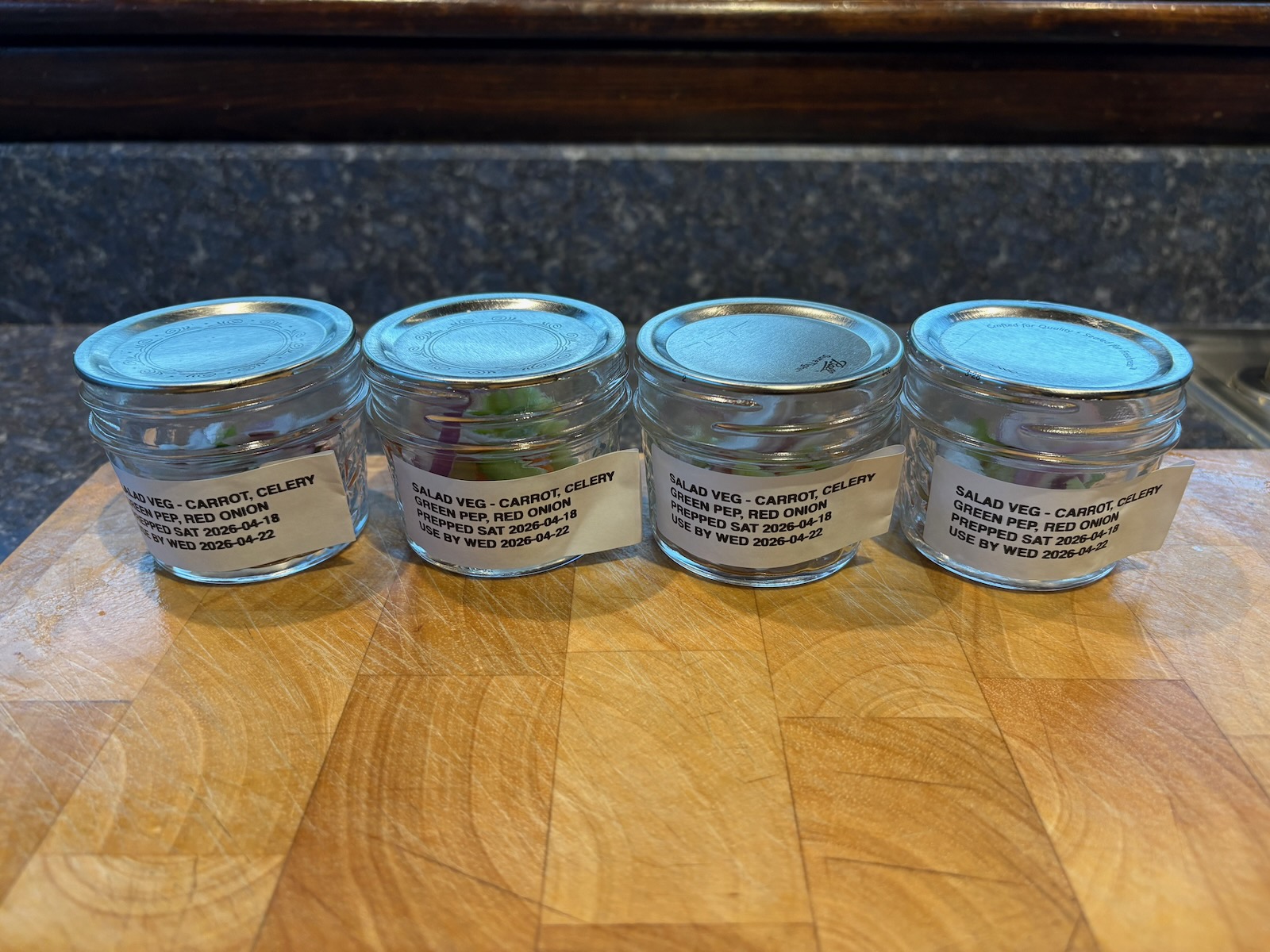 Prepped 4 servings of salad veggies. With carrot, celery, green pepper, red onion.