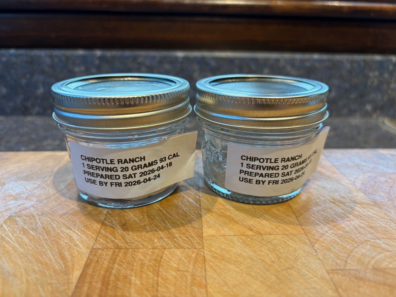 Prepped 2 servings of chipotle ranch salad dressing, 20 grams, 93 calories each.
