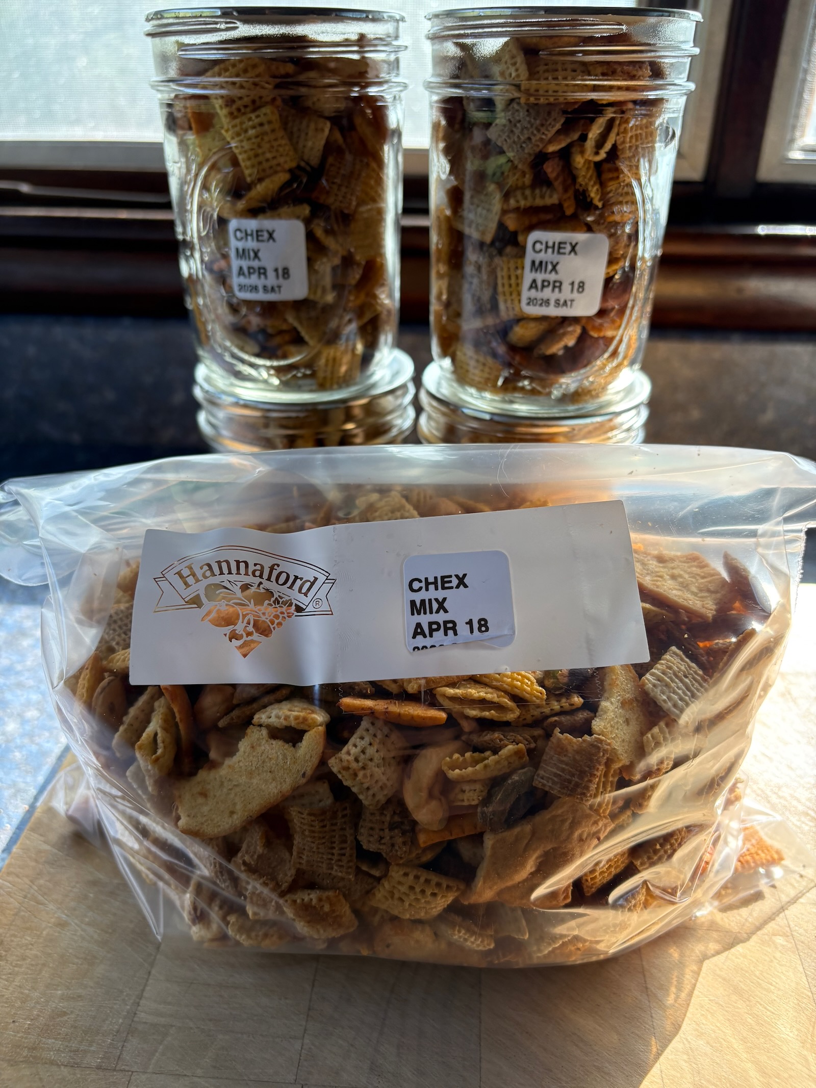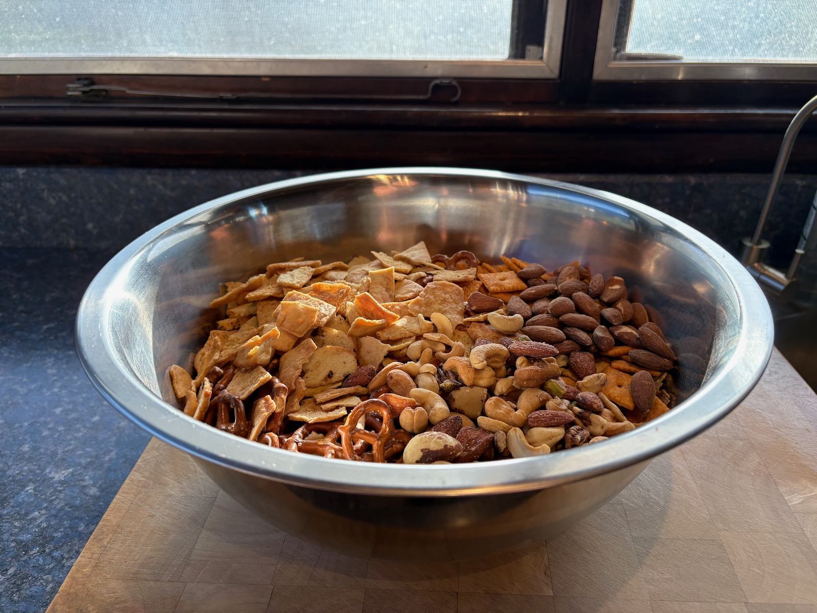 Snack: 1.0 oz. Sriracha chex mix. 0.8 oz. peanuts (136 cal). 0.8 oz. cashews (128 cal).