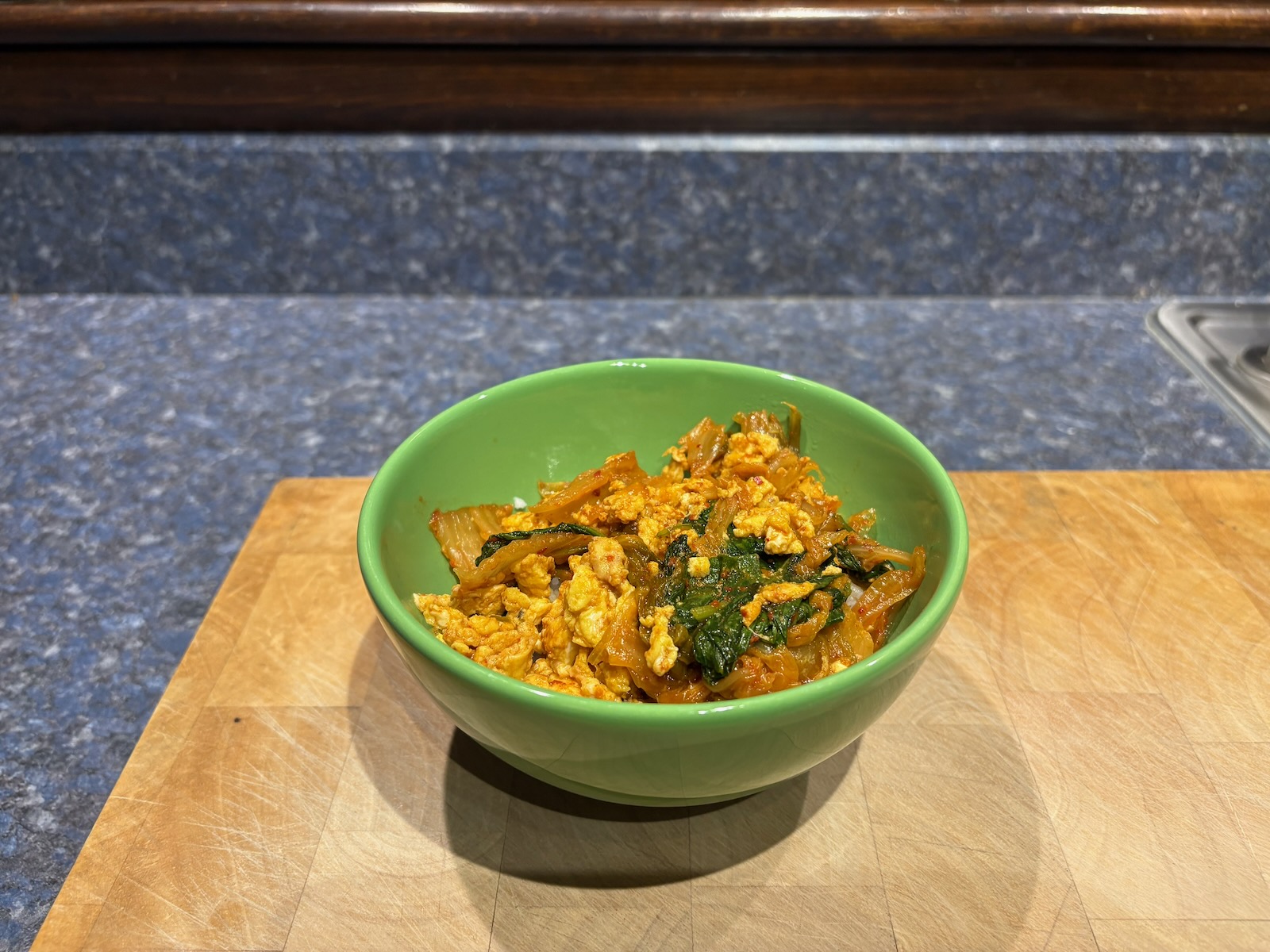 Breakfast: Kimchi scrambled eggs on a bed of rice.