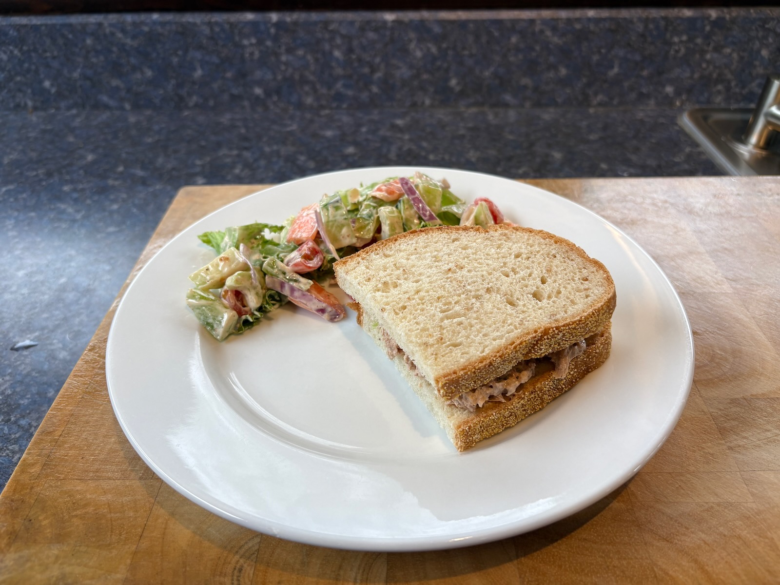 Lunch: Spicy tuna salad sandwich on Heidelberg French peasant bread. Salad with lettuce mix, cucumber, tomato, carrot, celery, green pepper, red onion, and chipotle ranch dressing (20 grams, 93 cal).