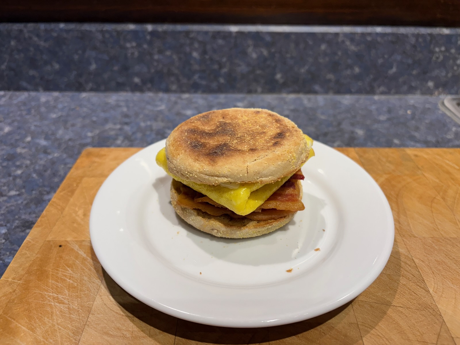 Breakfast: Bacon, egg and cheese English muffin.