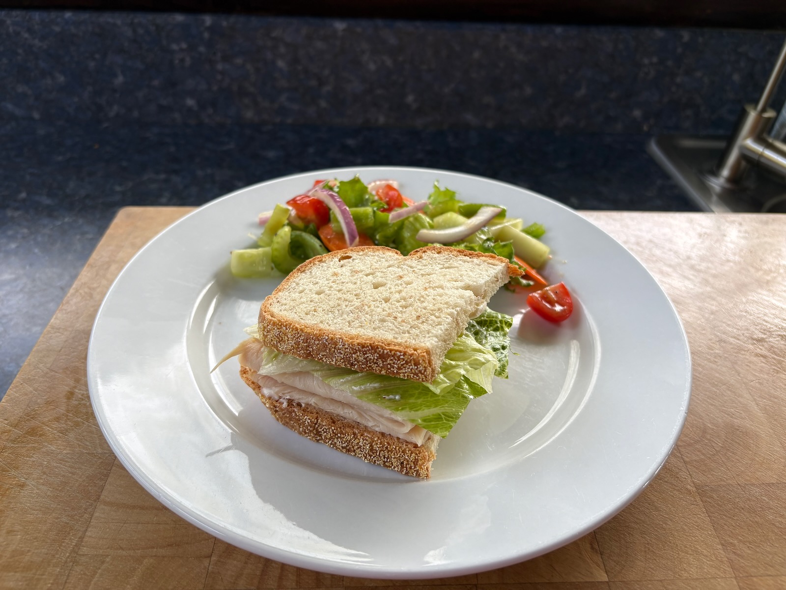 Lunch: Turkey sandwich with 1.9 oz. peppered deli turkey, lettuce, and mayo on Heidelberg French peasant bread. A side salad with lettuce mix, carrot, celery, green pepper, red onion, cucumber, tomato, and balsamic dressing.