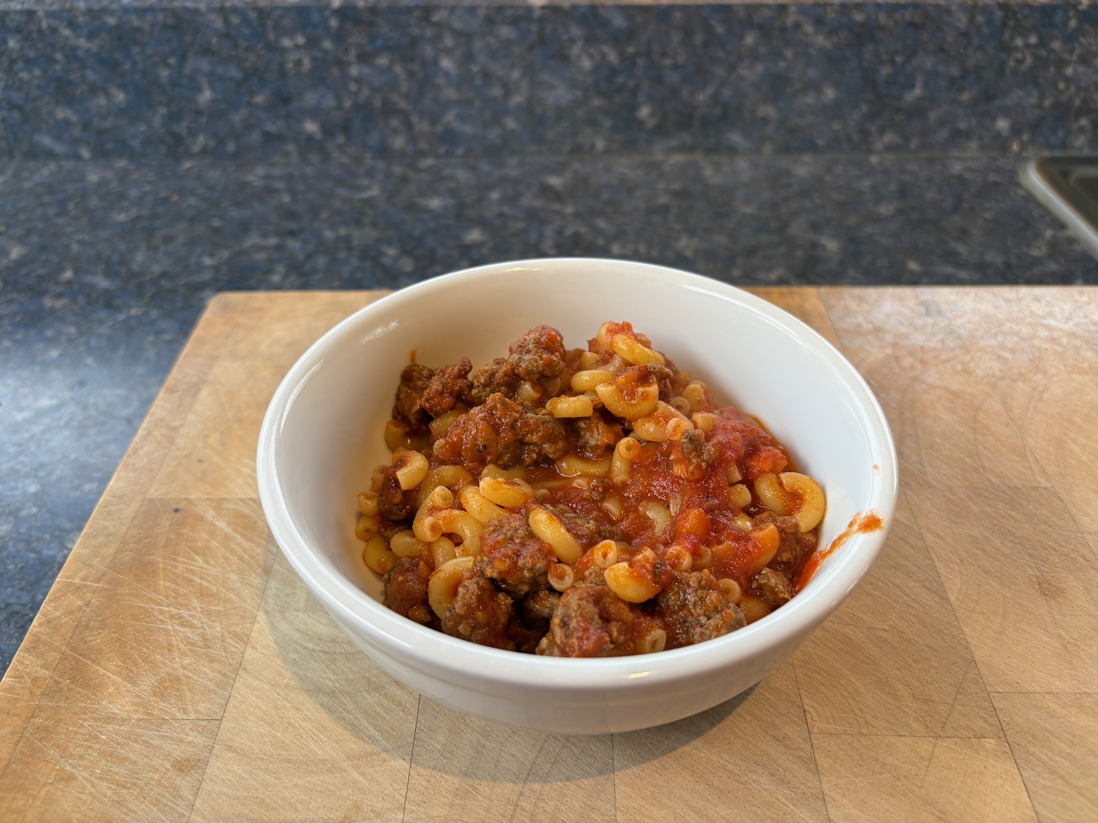 Dinner: Simple goulash with 2.5 oz. ground beef, onion, and garlic (previously frozen), 4.5 oz. marinara, and 1.6 oz. pasta elbows. A half glass of Bota Box cabernet sauvignon.