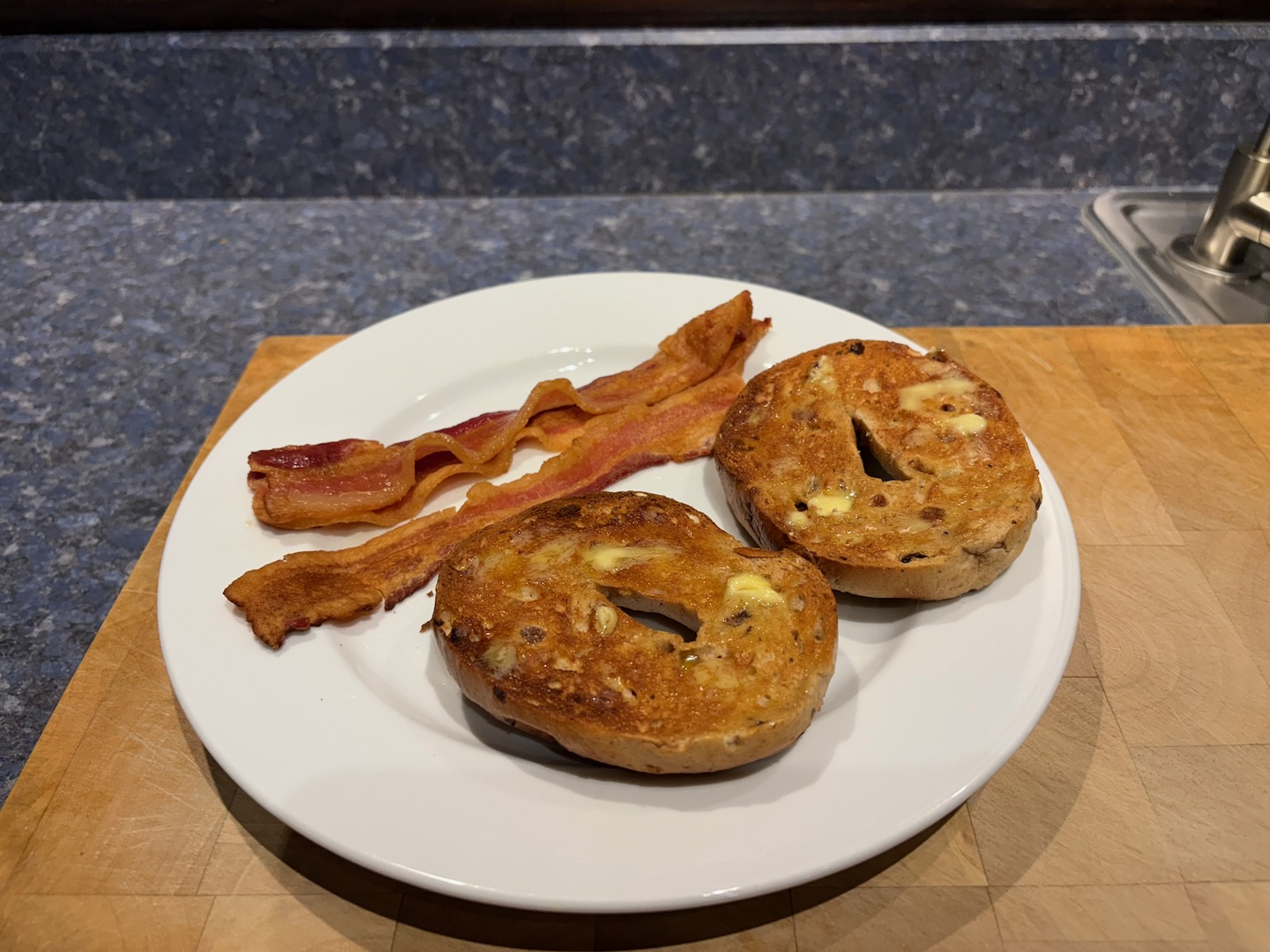 Breakfast: Toasted cinnamon raisin bagel with butter. Side of bacon.
