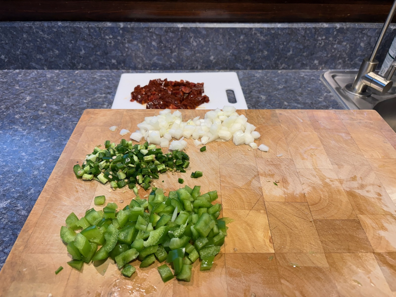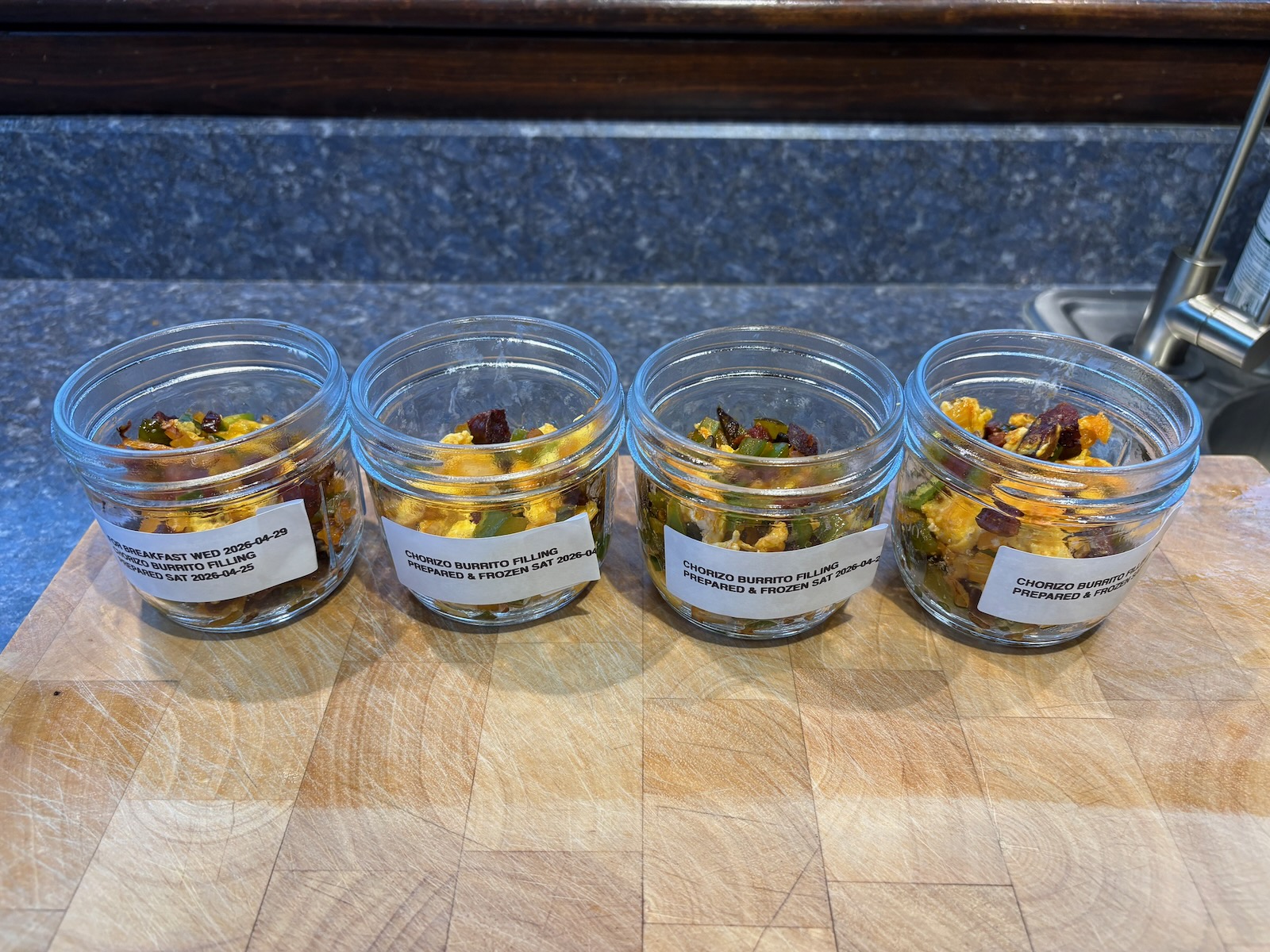 Made a double batch of the filling for chorizo breakfast burrito with chorizo, onion, green pepper, jalapeƱo, and egg for breakfast Wednesday. Refrigerated one serving for Wednesday and froze 3 servings.