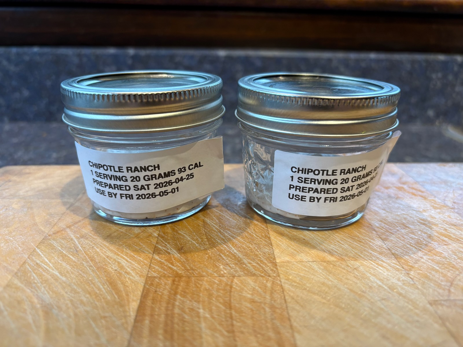 Prepped 2 servings of chipotle ranch salad dressing, 20 grams, 93 calories each.