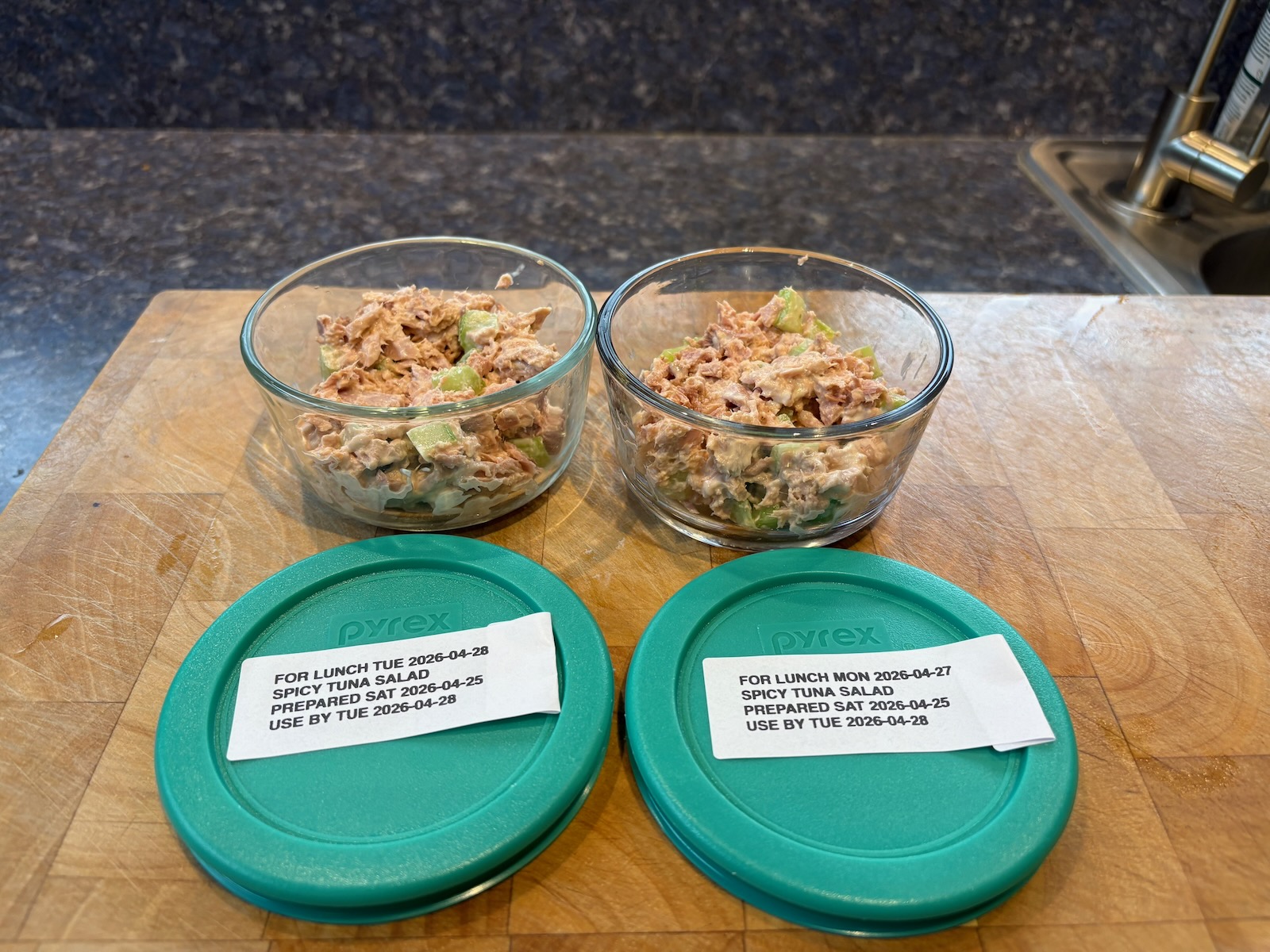 Prepped 2 servings of spicy tuna salad sandwich.