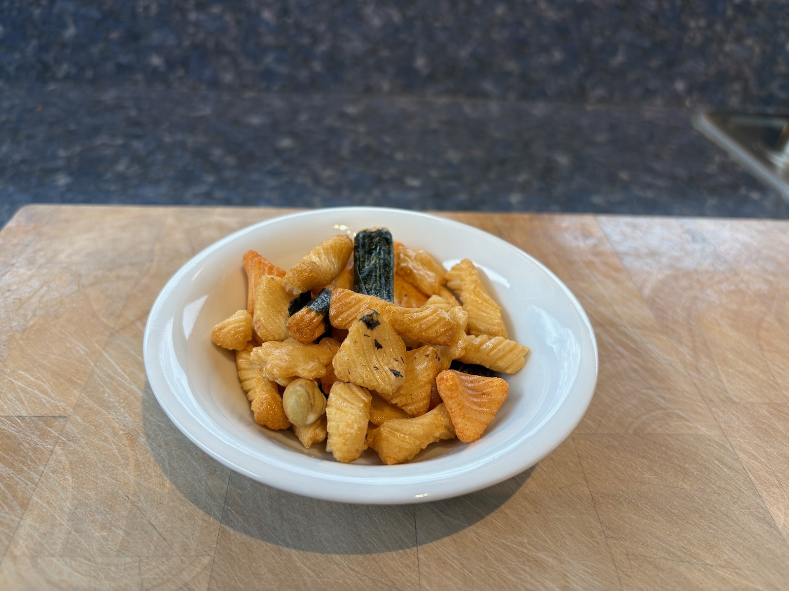 Snack: 2.0 oz. Japanese rice crackers. (1.0 oz. pictured.)