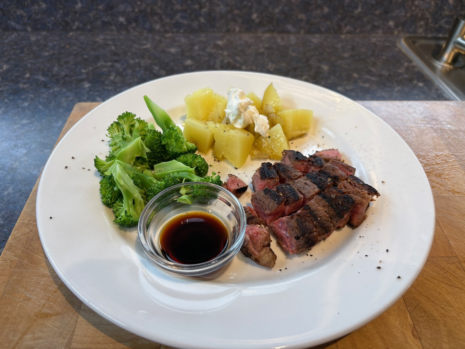 Dinner: Steak and baked potato. 3.1 oz. grilled NY strip steak. Broccoli. Half glass of Bota Box cabernet sauvignon.