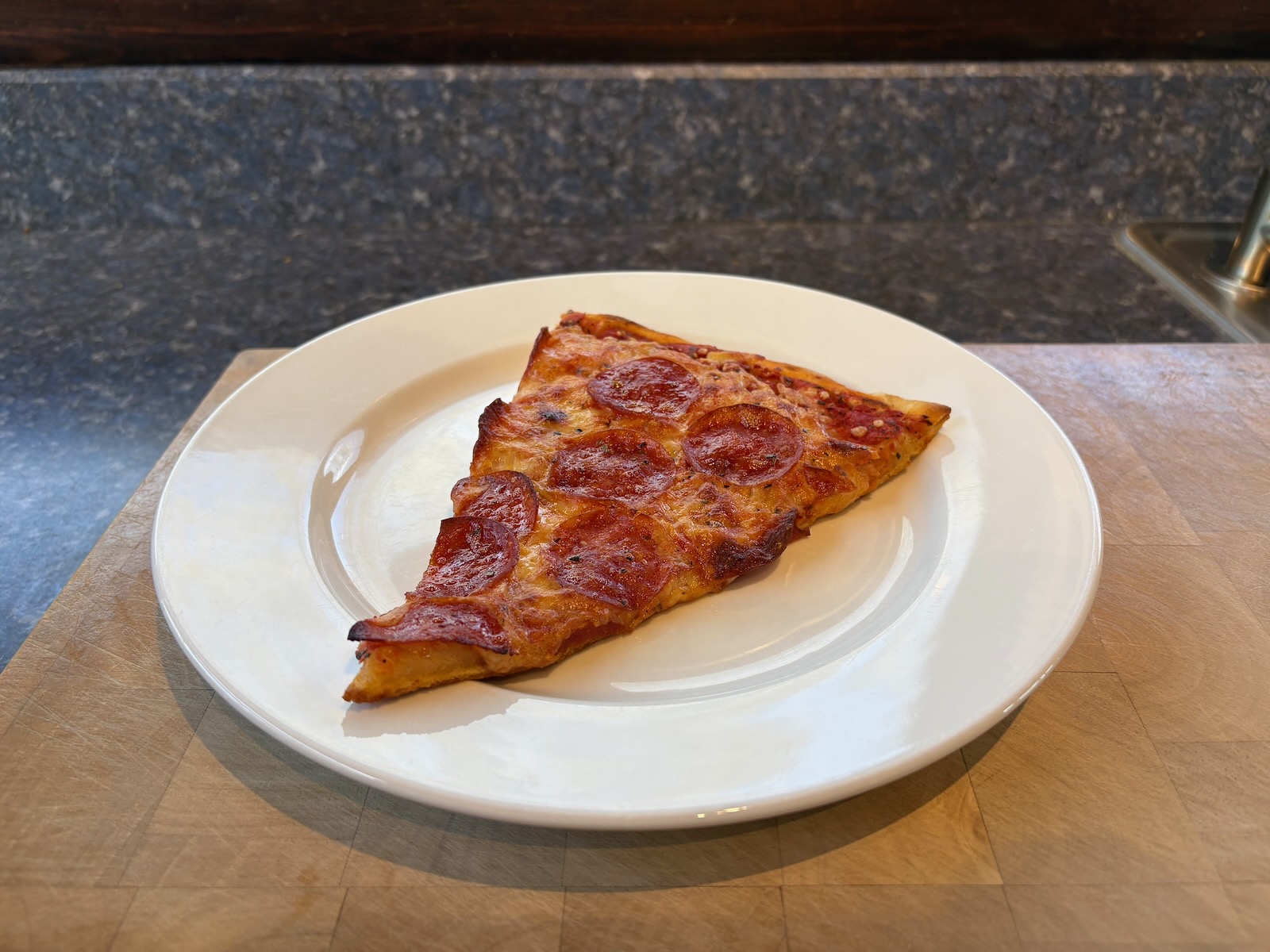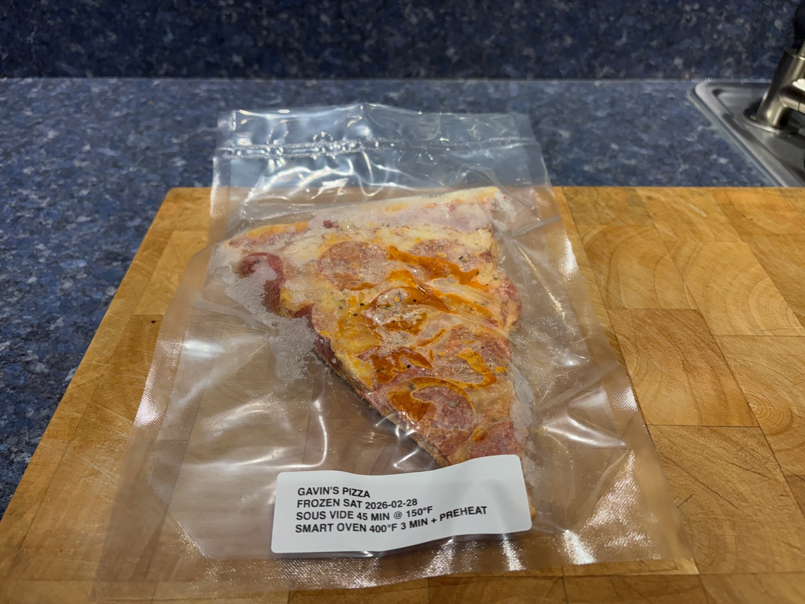 Dinner: 1 slice of Pepperoni pizza from Gavin's in Sidney, NY. It was vacuum sealed and frozen so I reheated it from frozen in the sous vide at 150°F, then transferred it to the Breville SmartOven, 400°F for 3 minutes, plus the preheat time, on a sheet pan. A half glass of Bota Box cabernet sauvignon.