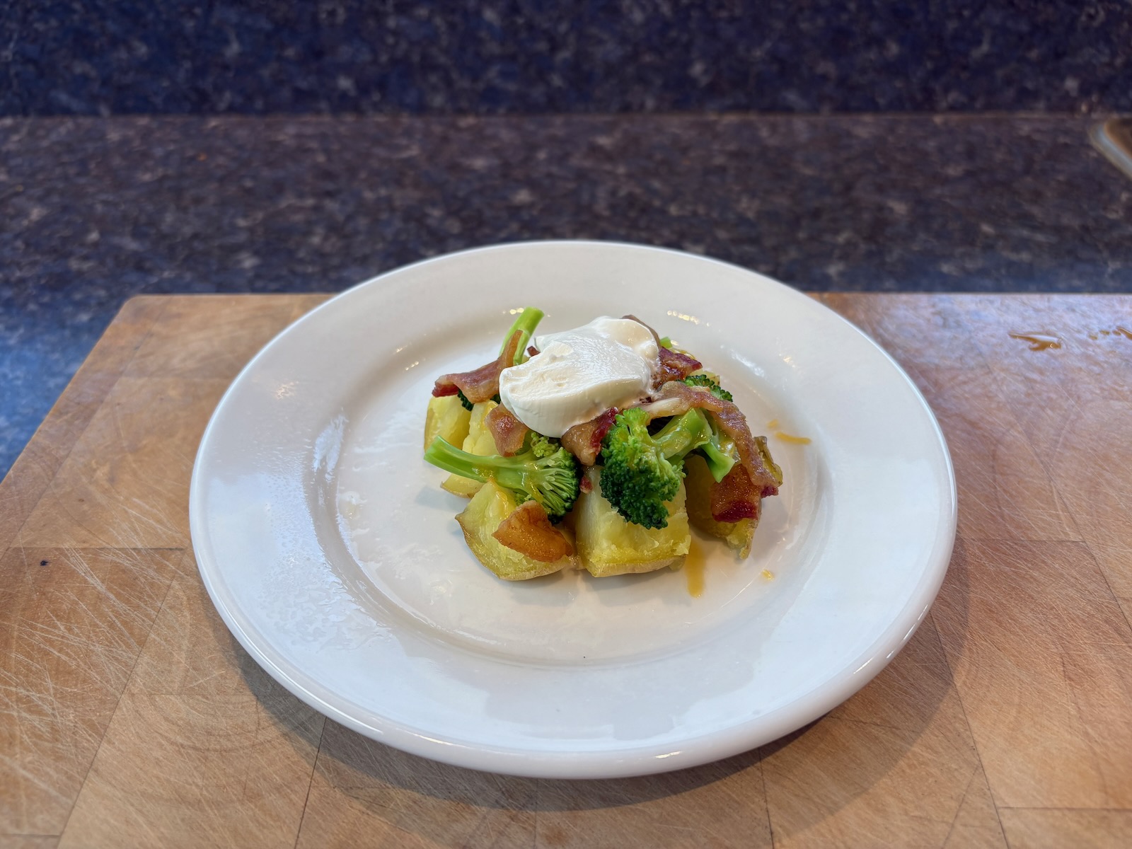 Lunch: Loaded baked potato with broccoli, bacon, cheese, and sour cream.