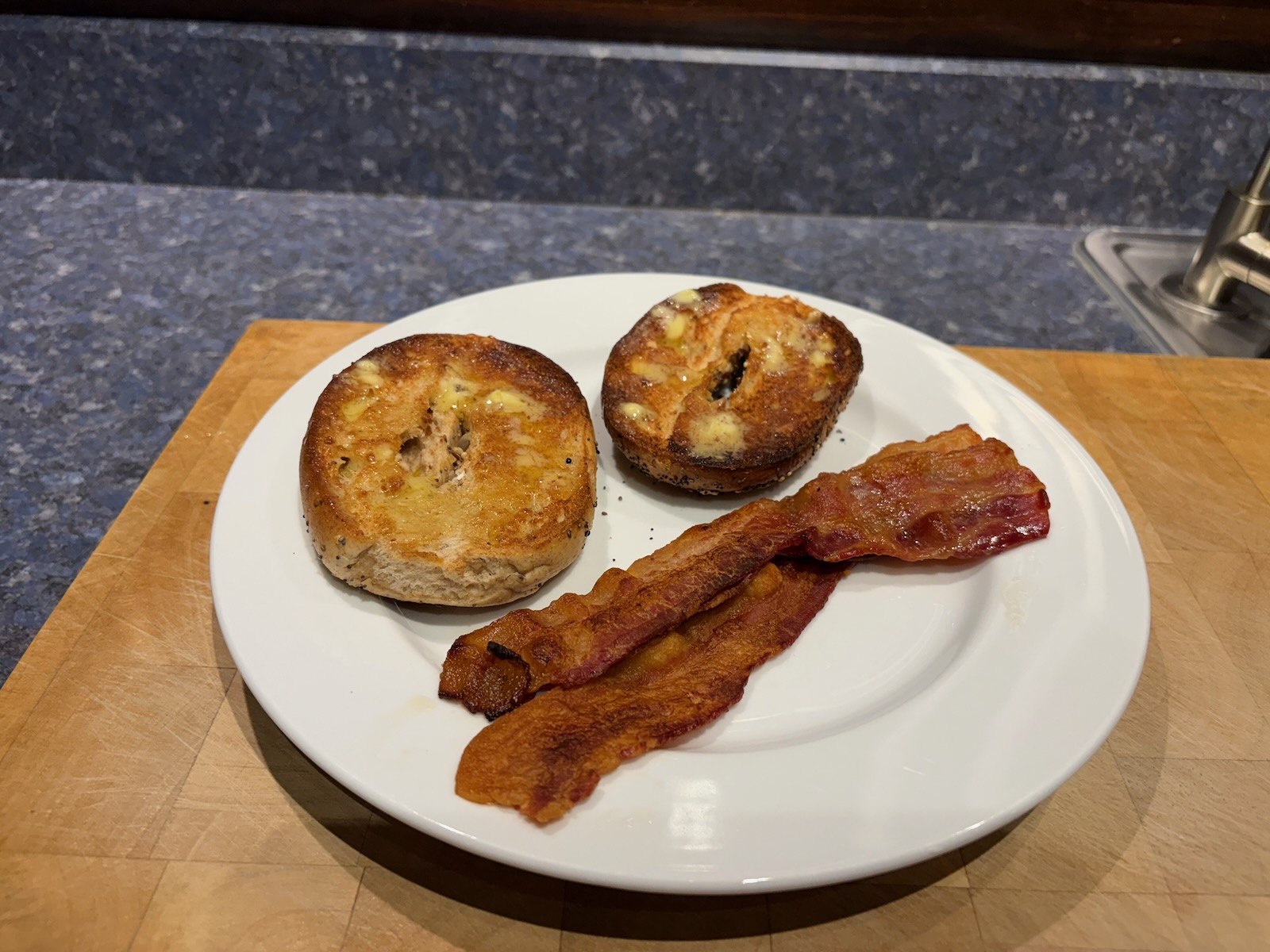 Breakfast: Toasted everything bagel with butter. Side of bacon.