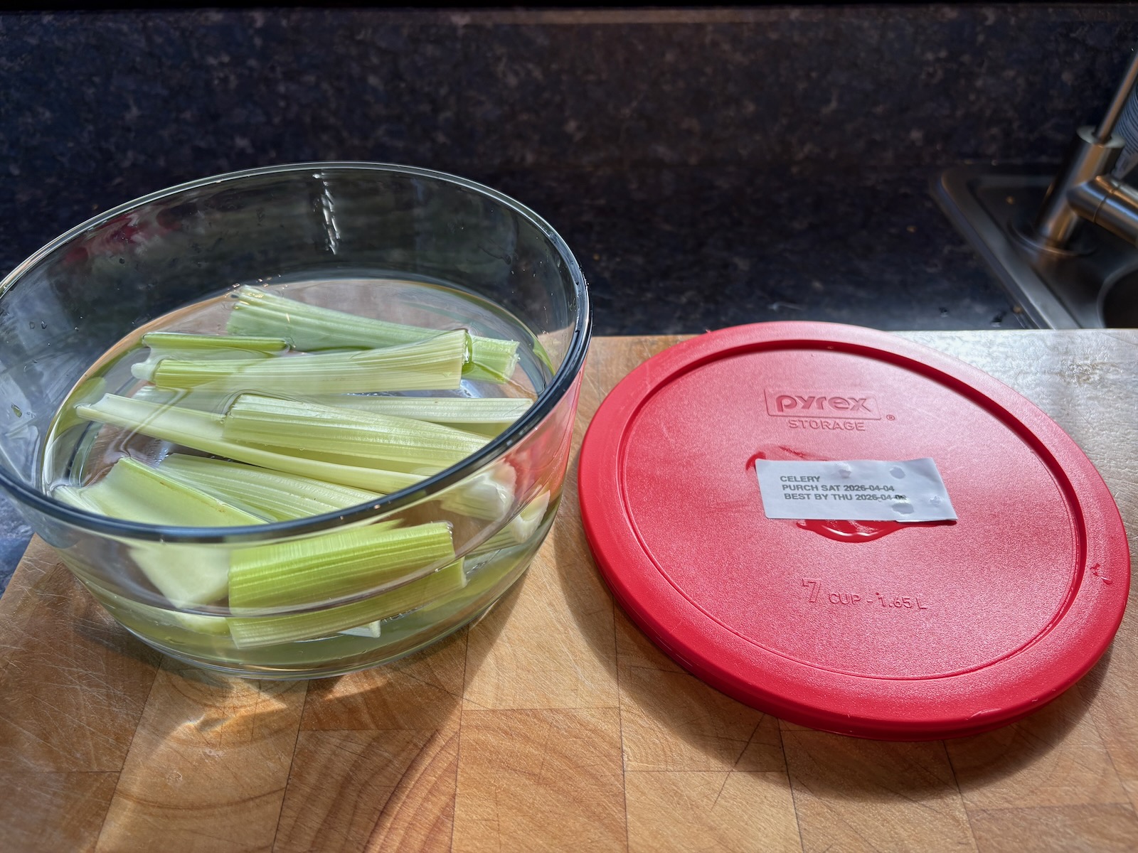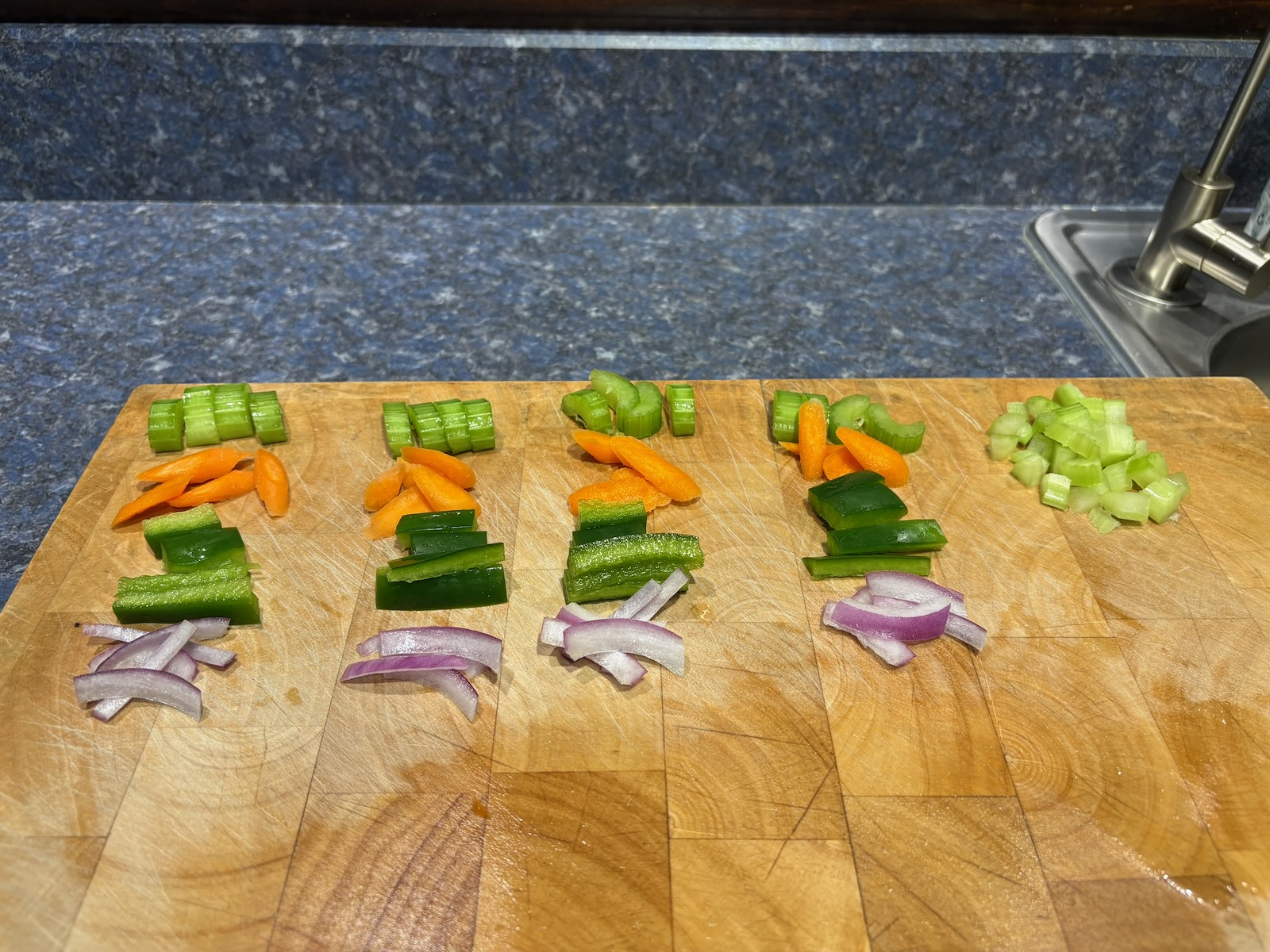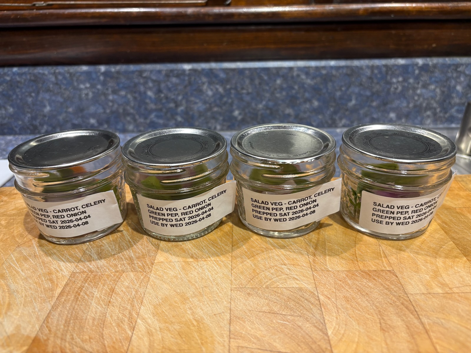 Prepped 4 servings of salad veggies. With carrot, celery, green pepper, red onion.