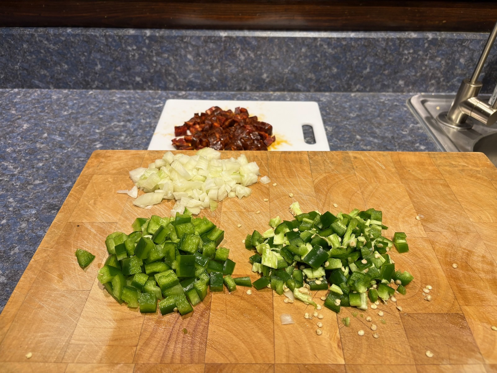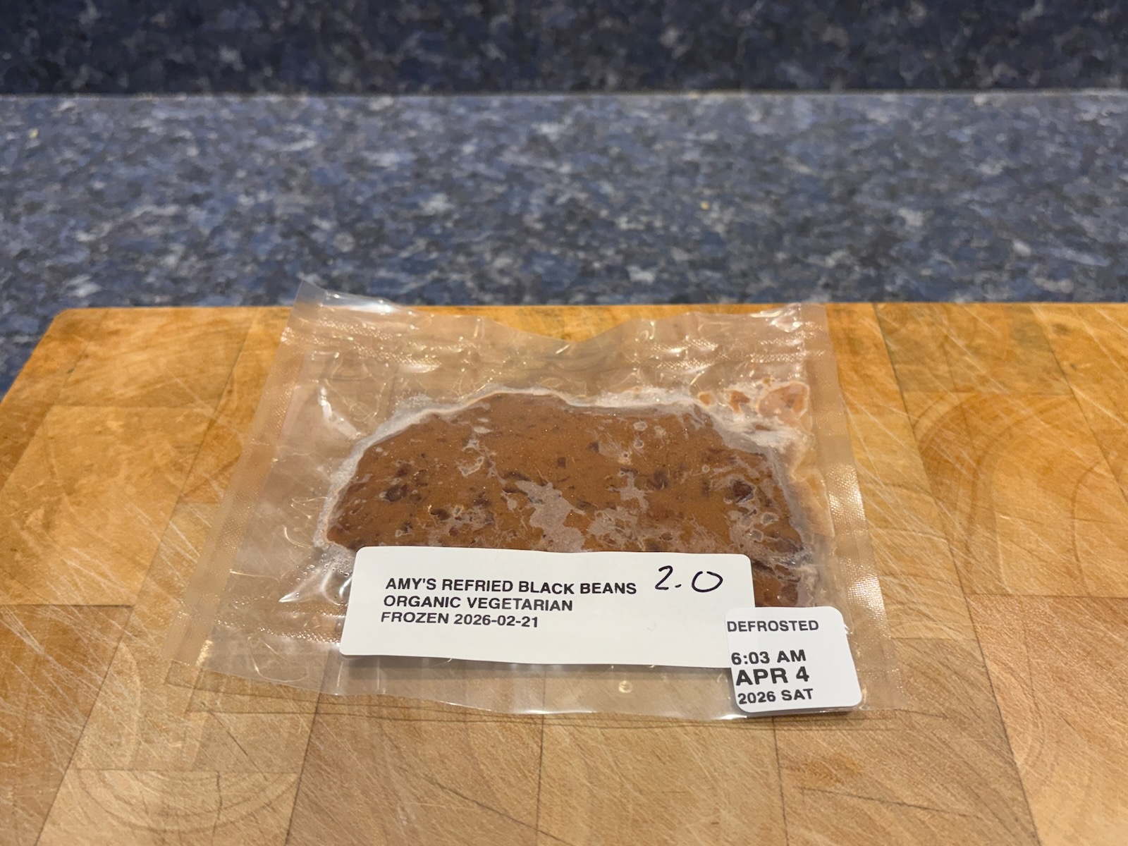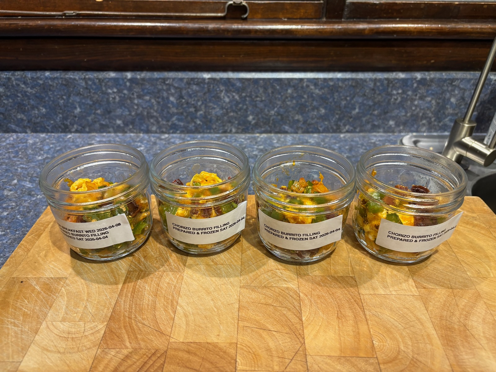 Made a double batch of the filling for chorizo breakfast burrito with chorizo, onion, green pepper, jalapeƱo, and egg for breakfast Wednesday. Refrigerated one serving for Wednesday and froze 3 servings.