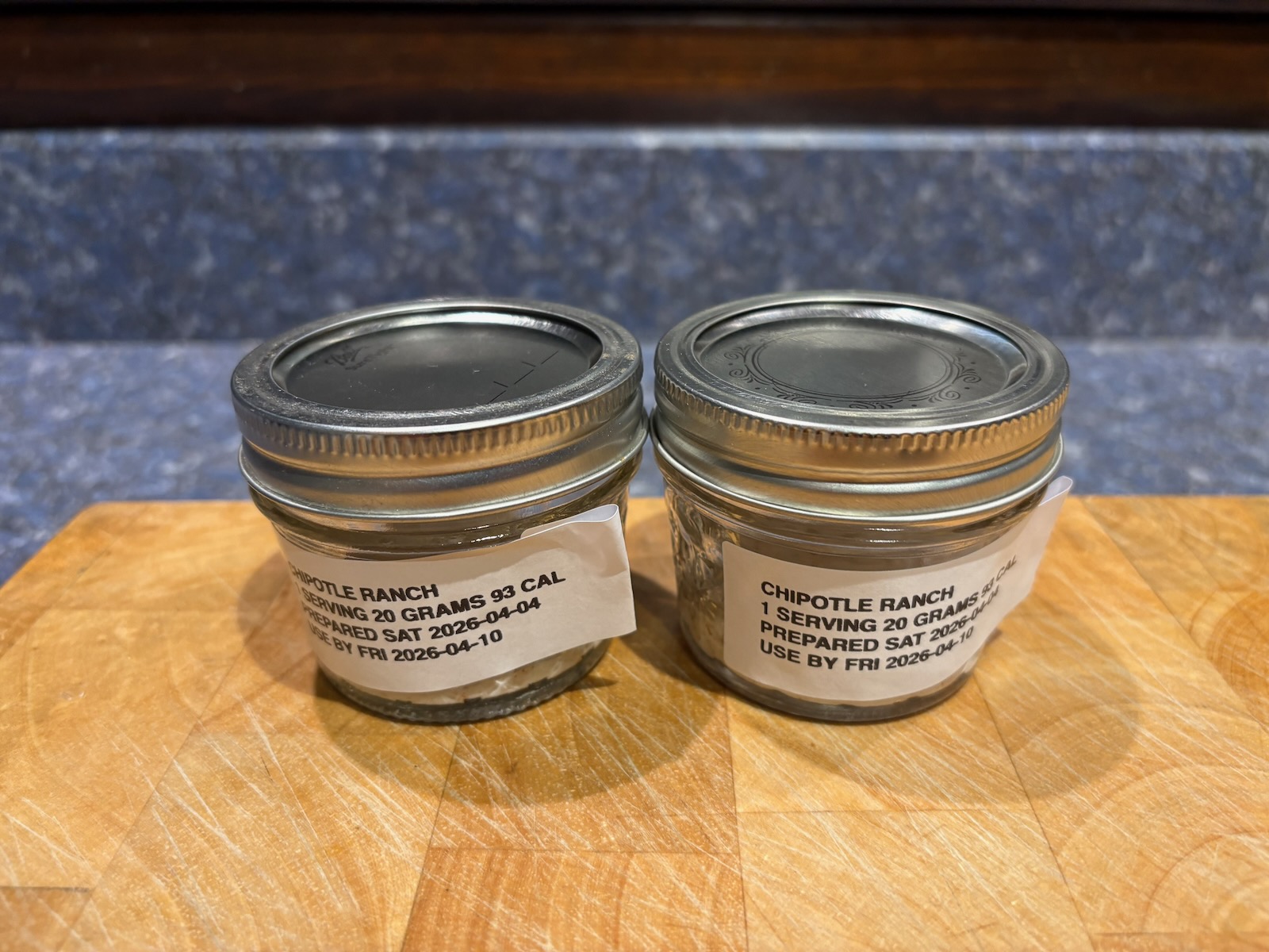 Prepped 2 servings of chipotle ranch salad dressing, 20 grams, 93 calories each.