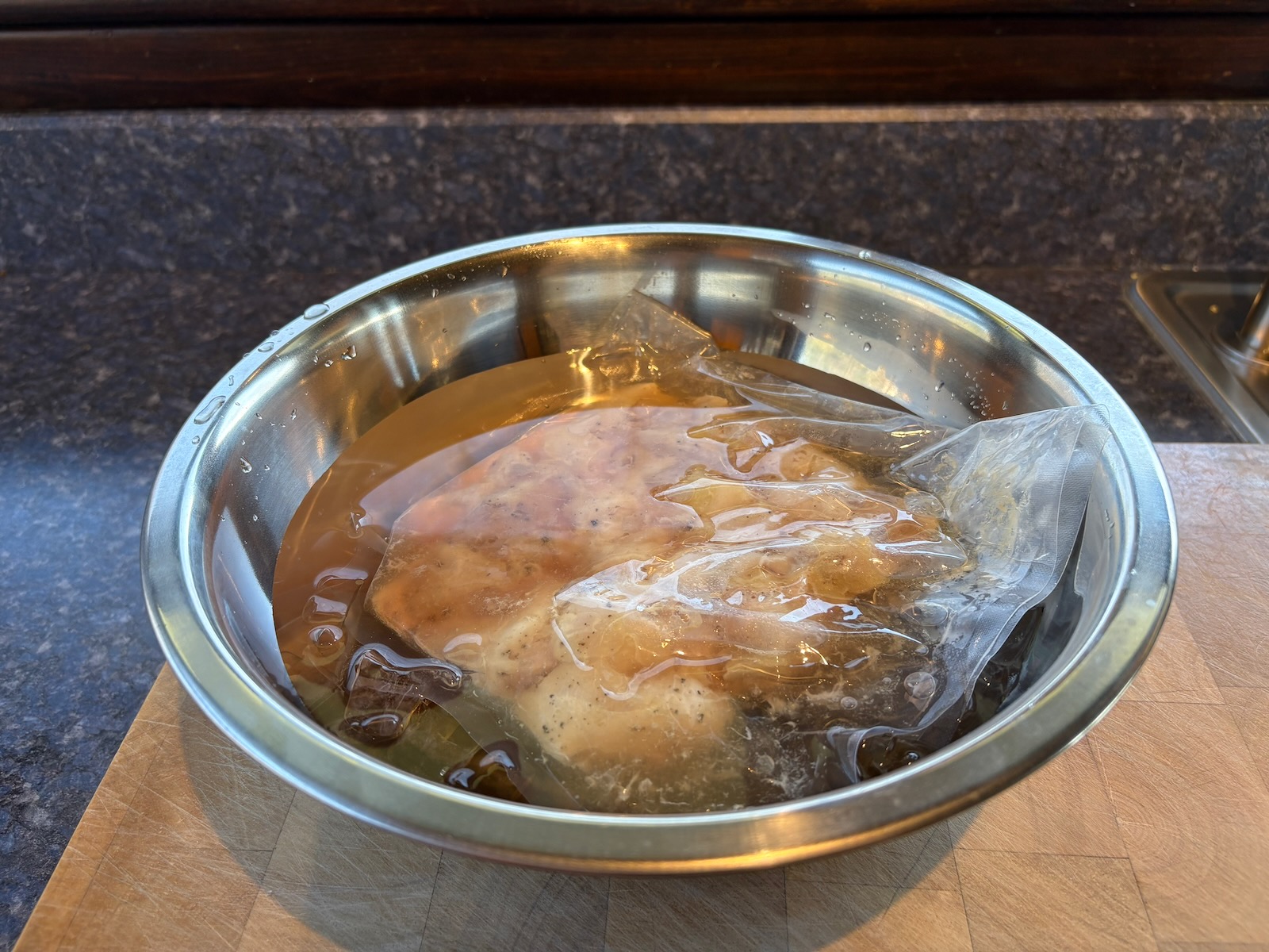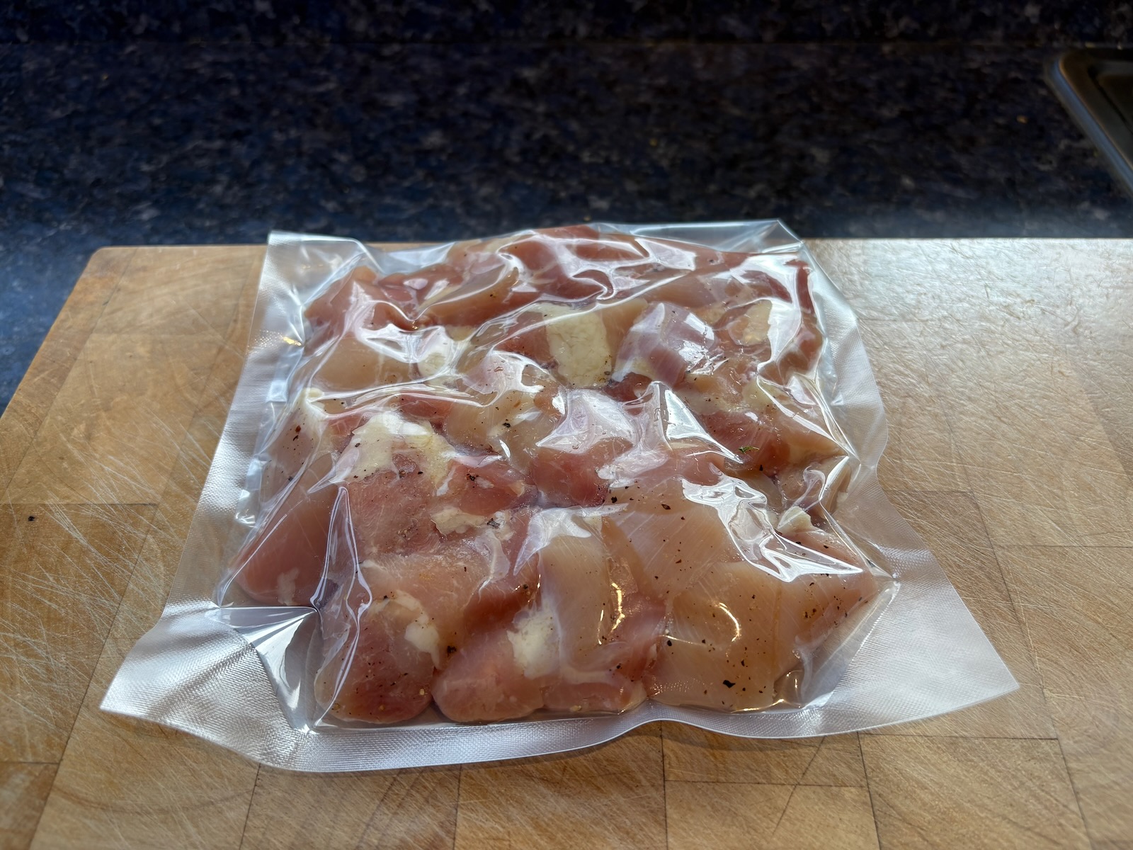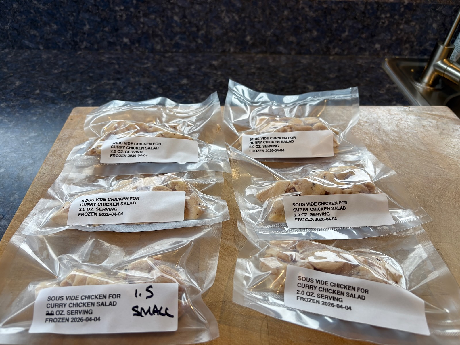 Made a batch of sous vide chicken for Curry chicken salad sandwich. The original package contained 4 boneless, skinless thighs, 1.13 lb. total.