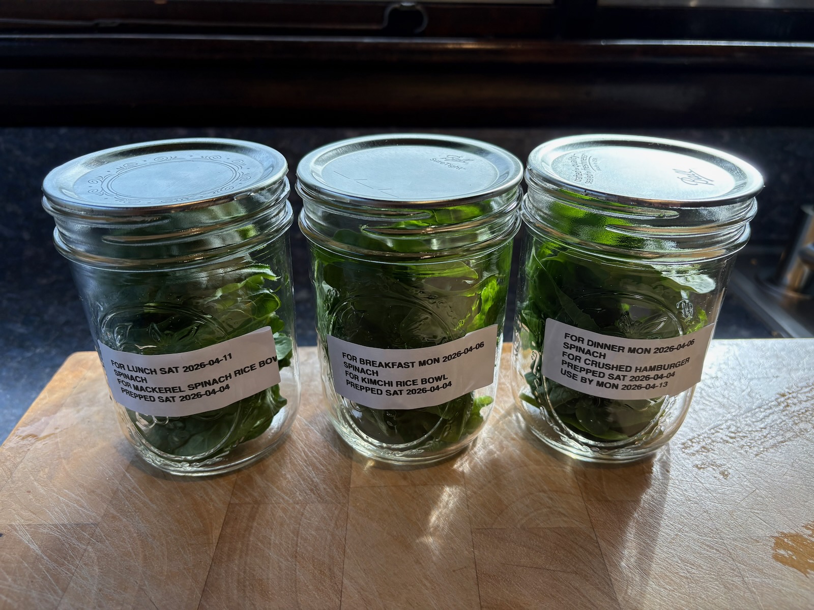 Prepped, vacuum sealed, and refrigerated jars of spinach.